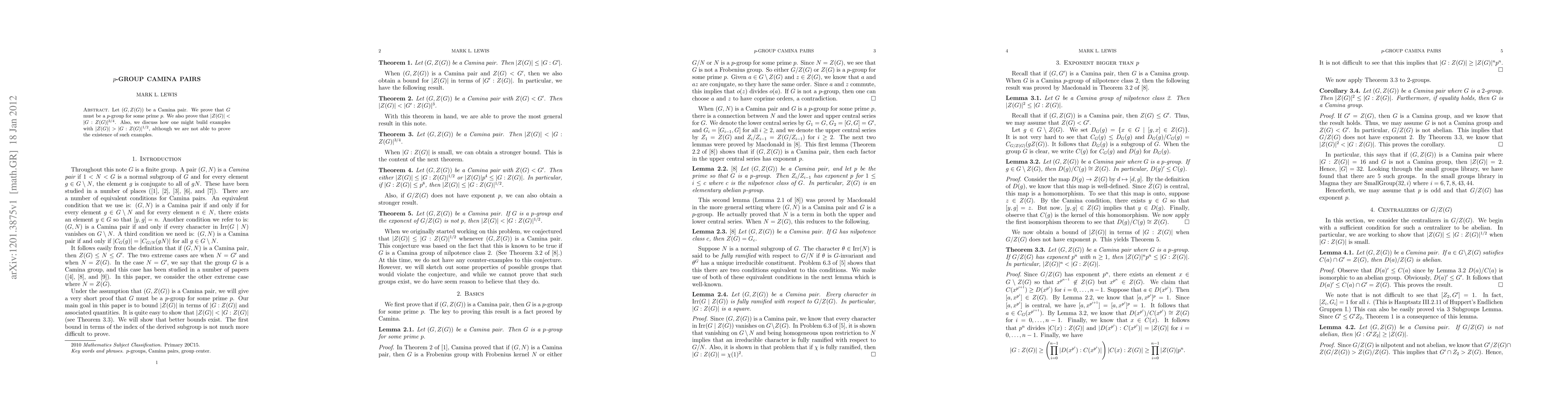Let $(G,Z(G))$ be a Camina pair. We prove that $G$ must be a $p$-group for some prime $p$. We also prove that $|Z(G)| < |G:Z(G)|^{3/4}$. Also, we discuss how one might build examples with $|Z(G)| > |G:Z(G)|^{1/2}$, although we are not able to prove the existence of such examples.