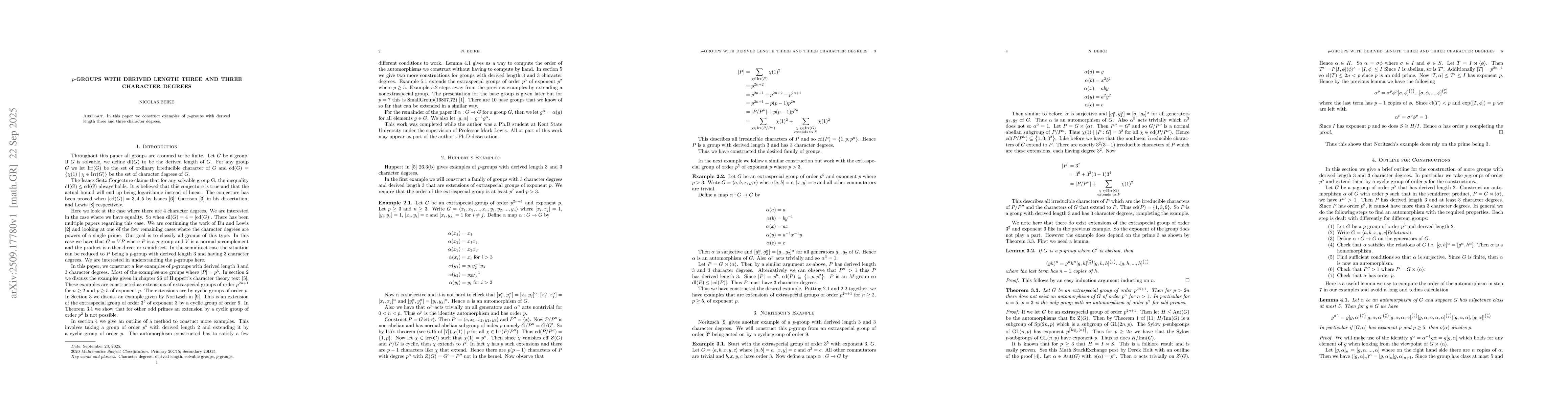 The paper constructs examples of p-groups with derived length three and three character degrees through explicit group extensions and automorphism analysis.