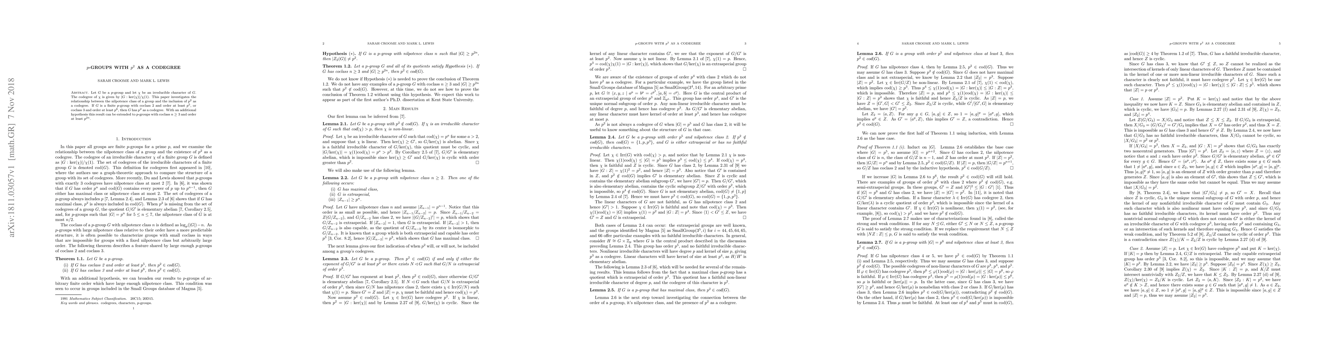 Let $G$ be a $p$-group and let $\chi$ be an irreducible character of $G$. The codegree of $\chi$ is given by $|G:\text{ker}(\chi)|/\chi(1)$. This paper investigates the relationship between the nilpotence class of a group and the inclusion of $p^2$ as a codegree. If $G$ is a finite $p$-group with coclass $2$ and order at least $p^5$, or coclass $3$ and order at least $p^6$, then $G$ has $p^2$ as a codegree. With an additional hypothesis this result can be extended to $p$-groups with coclass $n\ge 3$ and order at least $p^{2n}$.