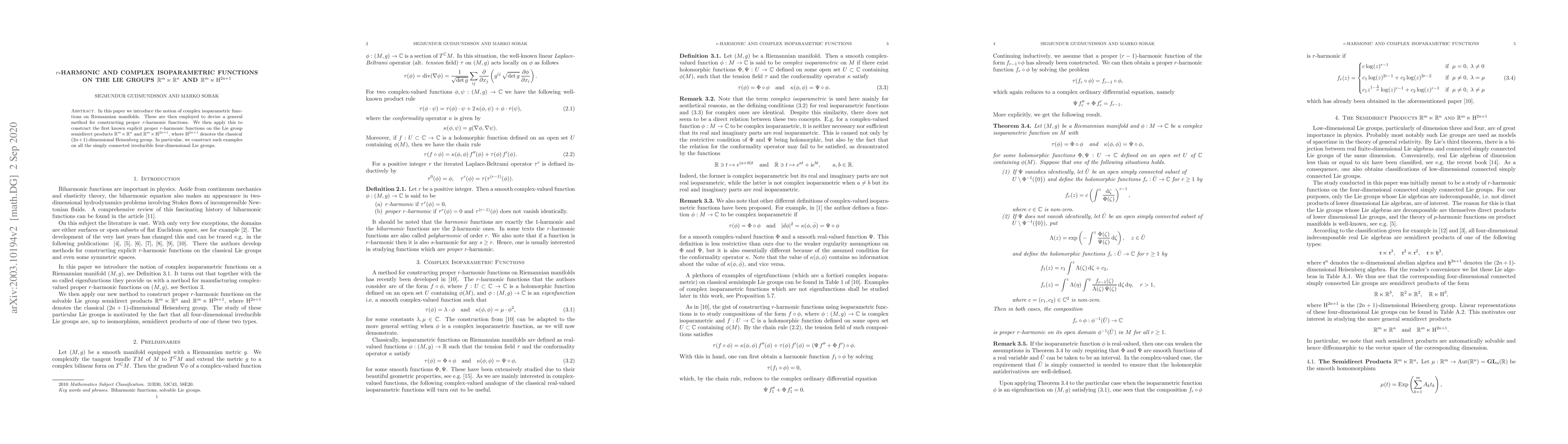 This paper introduces complex isoparametric functions on Riemannian manifolds and uses them to build proper $p$-harmonic functions. It provides the first explicit examples of such functions on specific Lie group semidirect products, including $\mathbb{R}^m \ltimes \mathbb{R}^n$ and $\mathbb{R}^m \ltimes \mathrm{H}^{2n+1}$.