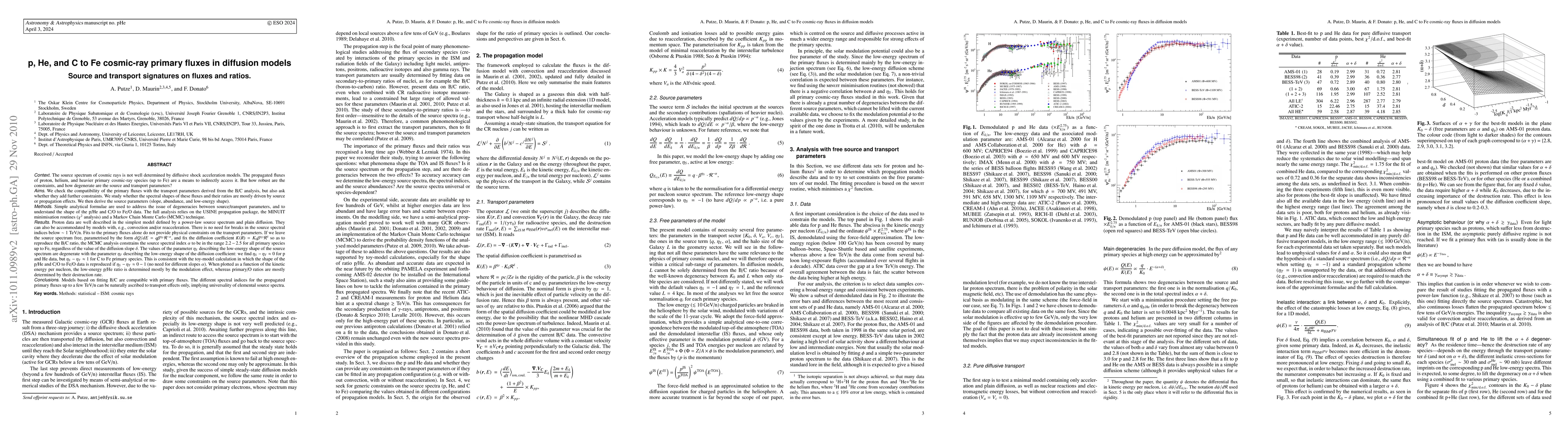 The propagated fluxes of proton, helium, and heavier primary cosmic-ray species (up to Fe) are a means to indirectly access the source spectrum of cosmic rays. We check the compatibility of the primary fluxes with the transport parameters derived from the B/C analysis, but also if they bring further constraints. Proton data are well described in the simplest model defined by a power-law source spectrum and plain diffusion. They can also be accommodated by models with, e.g., convection and/or reacceleration. There is no need for breaks in the source spectral indices below $\sim 1$ TeV/n. Fits on the primary fluxes alone do not provide physical constraints on the transport parameters. If we let free the source spectrum $dQ/dE = q \beta^{\eta_S} {\cal R}^{-\alpha}$ and fix the diffusion coefficient $K(R)= K_0\beta^{\eta_T} {\cal R}^{\delta}$ such as to reproduce the B/C ratio, the MCMC analysis constrains the source spectral index $\alpha$ to be in the range $2.2-2.5$ for all primary species up to Fe, regardless of the value of the diffusion slope $\delta$. The $\eta_S$ low-energy shape of the source spectrum is degenerate with the low-energy shape $\eta_T$ of the diffusion coefficient: we find $\eta_S-\eta_T\approx 0$ for p and He data, but $\eta_S-\eta_T\approx 1$ for C to Fe primary species. This is consistent with the toy-model calculation in which the shape of the p/He and C/O to Fe/O data is reproduced if $\eta_S-\eta_T\approx 0-1$ (no need for different slopes $\alpha$). When plotted as a function of the kinetic energy per nucleon, the low-energy p/He ratio is shaped mostly by the modulation effect, whereas primary/O ratios are mostly shaped by their destruction rate.