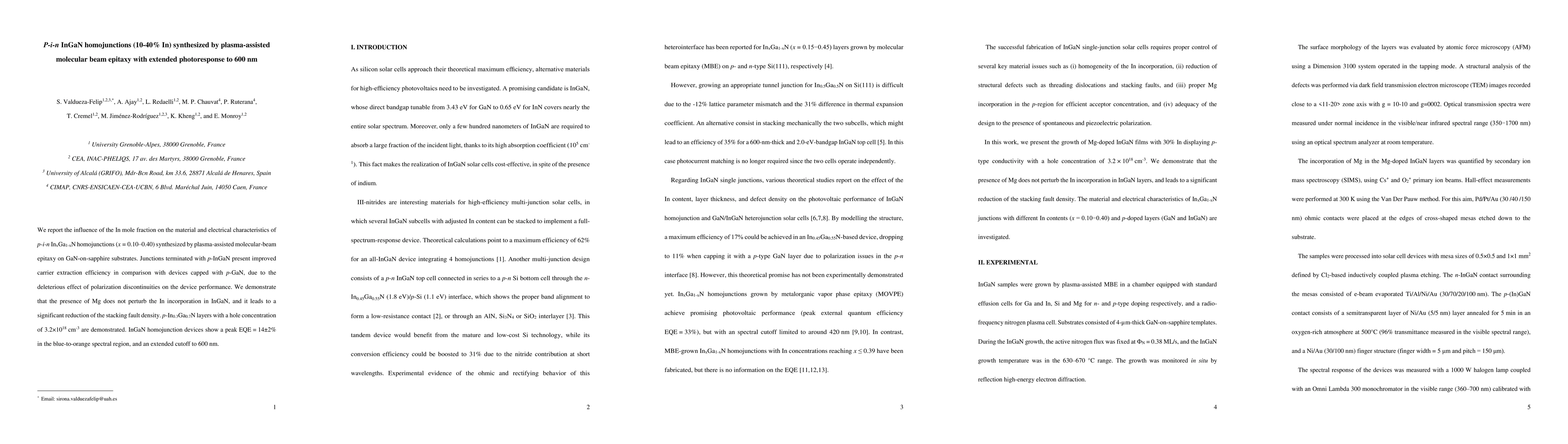 This paper investigates the impact of In mole fraction on p-i-n InGaN homojunctions synthesized via plasma-assisted molecular beam epitaxy, showing improved carrier extraction efficiency and extended photoresponse up to 600 nm. The study finds that Mg incorporation does not hinder InGaN formation and reduces stacking fault density.