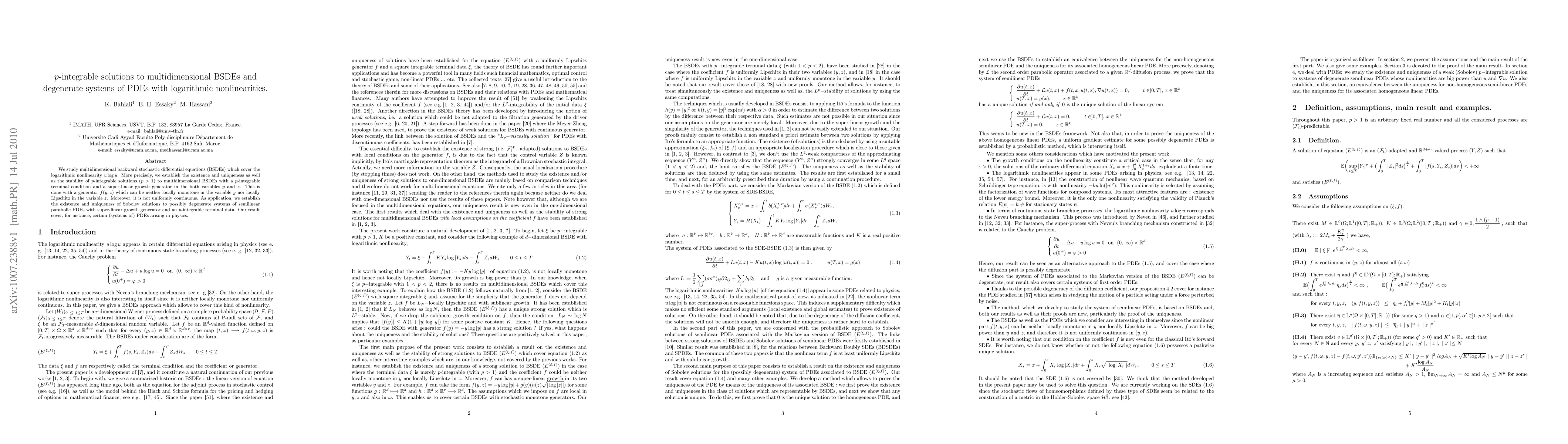 This paper establishes the existence, uniqueness, and stability of p-integrable solutions to multidimensional BSDEs with logarithmic nonlinearities and super-linear growth generators. It also applies these results to prove the existence and uniqueness of Sobolev solutions for degenerate systems of semilinear parabolic PDEs.