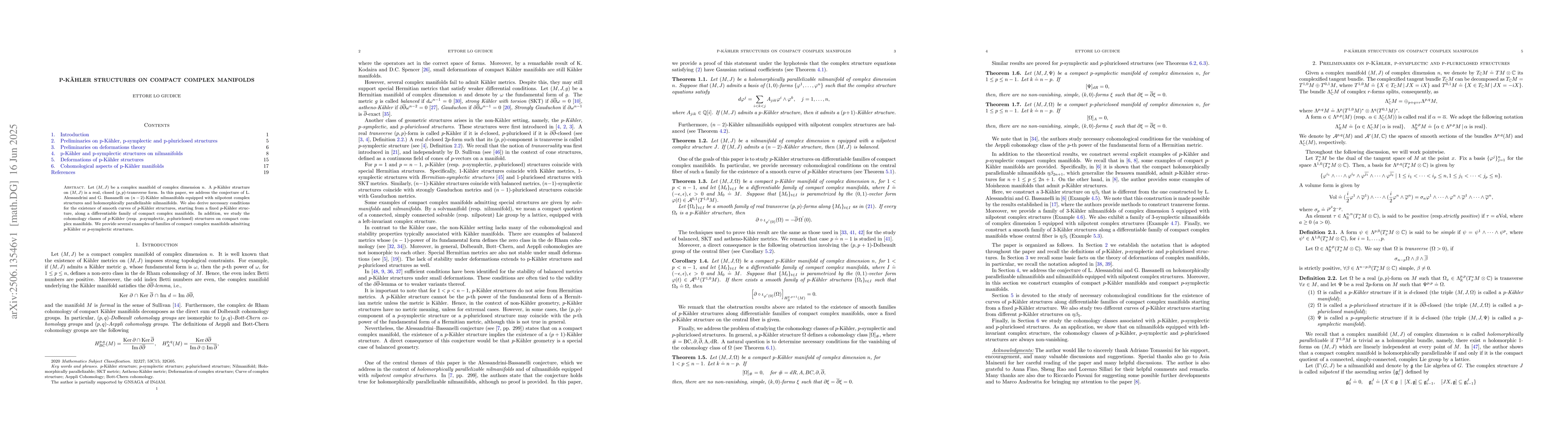 Let $(M,J)$ be a complex manifold of complex dimension $n$. A $p$-K\"ahler structure on $(M,J)$ is a real, closed $(p,p)$-transverse form. In this paper, we address the conjecture of L. Alessandrini and G. Bassanelli on $(n-2)$-K\"ahler nilmanifolds equipped with nilpotent complex structures and holomorphically parallelizable nilmanifolds. We also derive necessary conditions for the existence of smooth curves of $p$-K\"ahler structures, starting from a fixed $p$-K\"ahler structure, along a differentiable family of compact complex manifolds. In addition, we study the cohomology classes of $p$-K\"ahler (resp. $p$-symplectic, $p$-pluriclosed) structures on compact complex manifolds. We provide several examples of families of compact complex manifolds admitting $p$-K\"ahler or $p$-symplectic structures.