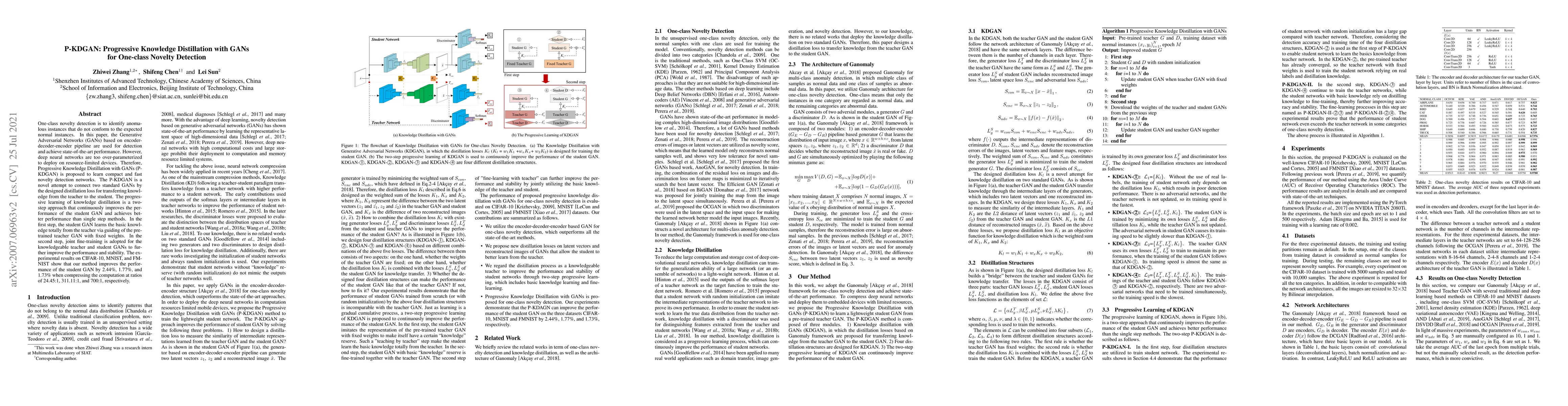 P-KDGAN employs progressive knowledge distillation between two GANs to create compact and efficient novelty detection networks, achieving better performance than single-step methods while significantly reducing computational requirements. Experimental results demonstrate improved detection performance and substantial compression ratios on CIFAR-10, MNIST, and FMNIST datasets.