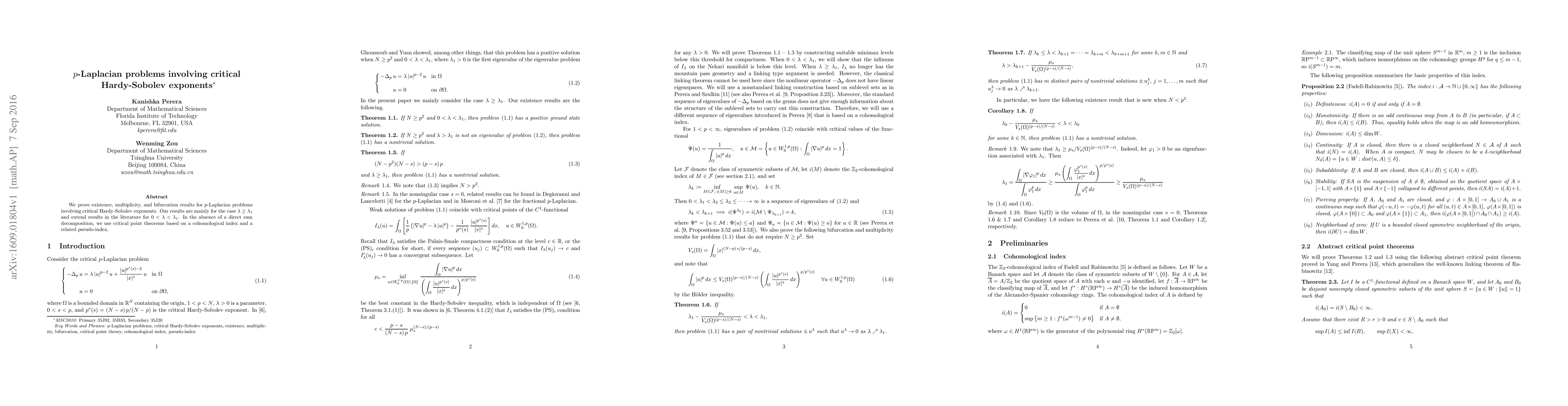 We prove existence, multiplicity, and bifurcation results for $p$-Laplacian problems involving critical Hardy-Sobolev exponents. Our results are mainly for the case $\lambda \ge \lambda_1$ and extend results in the literature for $0 < \lambda < \lambda_1$. In the absence of a direct sum decomposition, we use critical point theorems based on a cohomological index and a related pseudo-index.