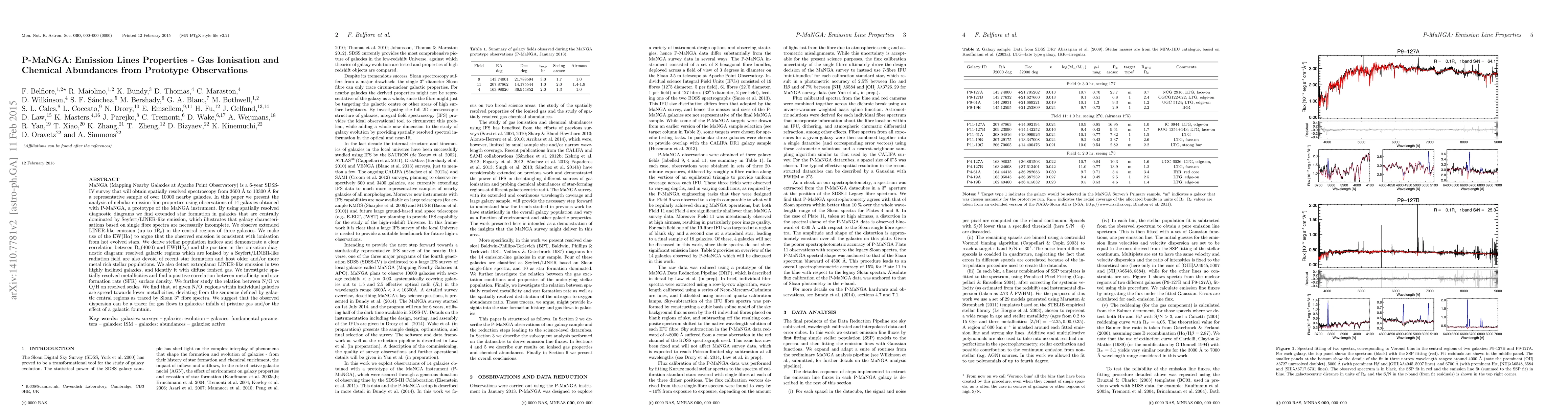 This paper analyzes nebular emission lines from 14 galaxies using P-MaNGA, a prototype of the MaNGA instrument, revealing extended star formation and LINER-like emission. The study shows that regions ionized by Seyfert/LINER-like radiation fields lack recent star formation and host older, more metal-rich stellar populations, suggesting incomplete galaxy characterizations based on single fibre spectra.
