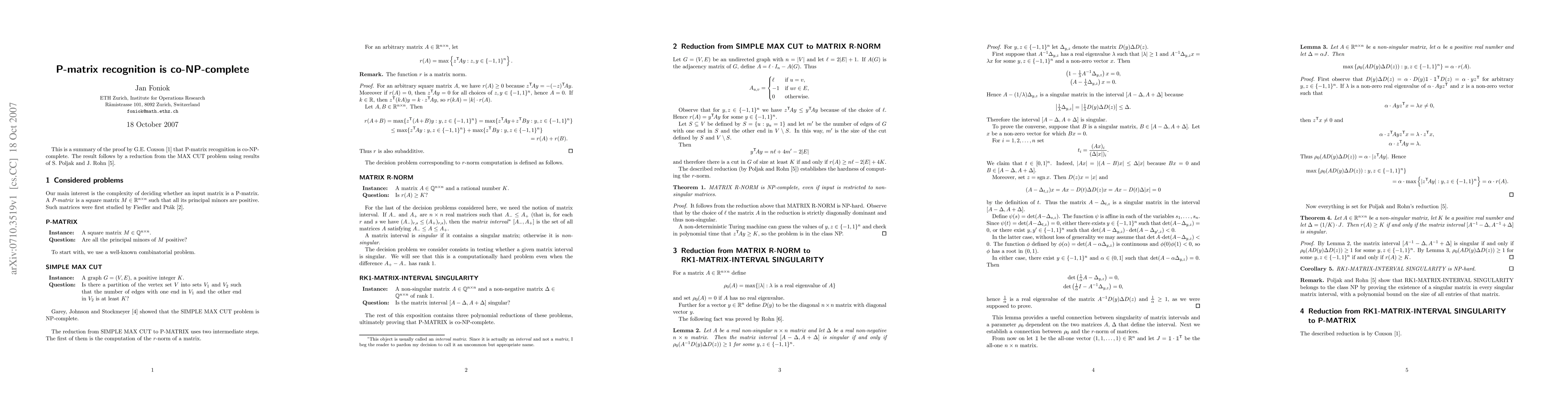 This paper proves that recognizing P-matrices is co-NP-complete through a reduction from the MAX CUT problem, leveraging results from S. Poljak and J. Rohn. G.E. Coxson's proof establishes the computational complexity of this problem.