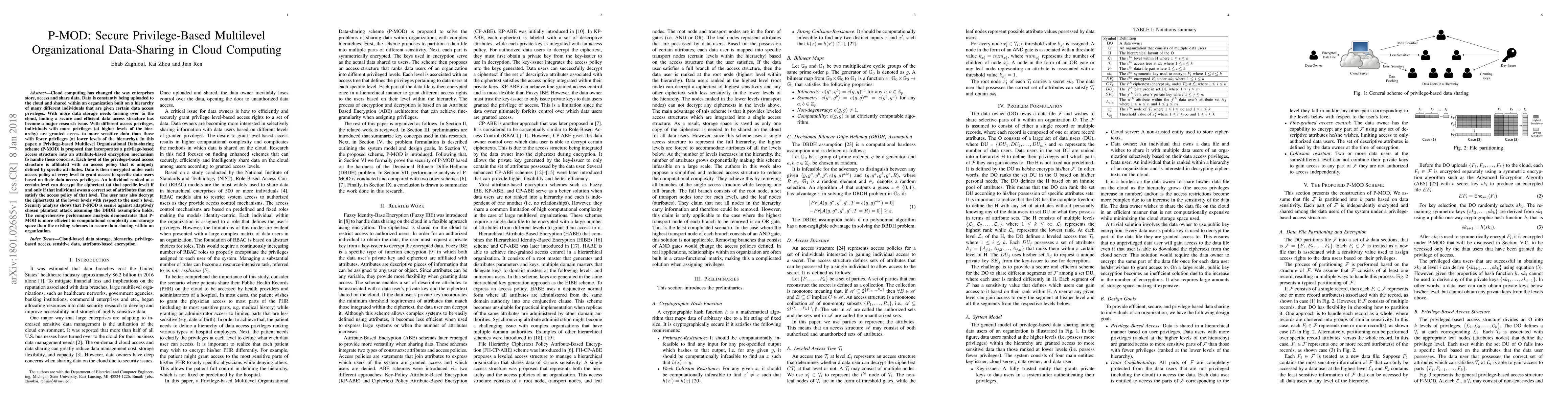 Cloud computing has changed the way enterprises store, access and share data. Data is constantly being uploaded to the cloud and shared within an organization built on a hierarchy of many different individuals that are given certain data access privileges. With more data storage needs turning over to the cloud, finding a secure and efficient data access structure has become a major research issue. With different access privileges, individuals with more privileges (at higher levels of the hierarchy) are granted access to more sensitive data than those with fewer privileges (at lower levels of the hierarchy). In this paper, a Privilege-based Multilevel Organizational Data-sharing scheme~(P-MOD) is proposed that incorporates a privilege-based access structure into an attribute-based encryption mechanism to handle these concerns. Each level of the privilege-based access structure is affiliated with an access policy that is uniquely defined by specific attributes. Data is then encrypted under each access policy at every level to grant access to specific data users based on their data access privileges. An individual ranked at a certain level can decrypt the ciphertext (at that specific level) if and only if that individual owns a correct set of attributes that can satisfy the access policy of that level. The user may also decrypt the ciphertexts at the lower levels with respect to the user's level. Security analysis shows that P-MOD is secure against adaptively chosen plaintext attack assuming the DBDH assumption holds.The comprehensive performance analysis demonstrates that P-MOD is more efficient in computational complexity and storage space than the existing schemes in secure data sharing within an organization.