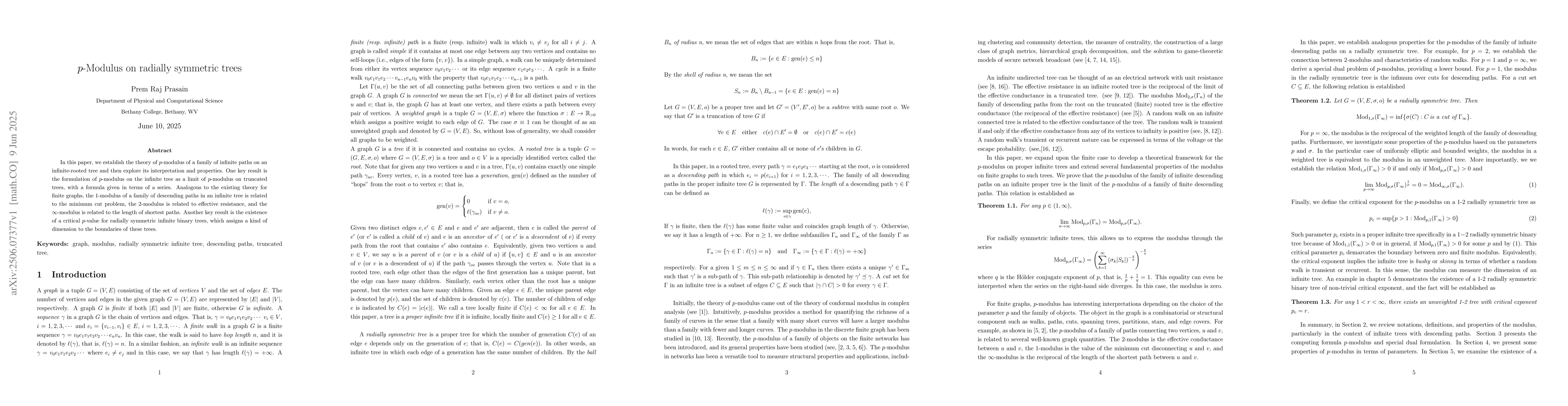 In this paper, we establish the theory of $p$-modulus of a family of infinite paths on an infinite-rooted tree and then explore its interpretation and properties. One key result is the formulation of $p$-modulus on the infinite tree as a limit of $p$-modulus on truncated trees, with a formula given in terms of a series. Analogous to the existing theory for finite graphs, the $1$-modulus of a family of descending paths in an infinite tree is related to the minimum cut problem, the $2$-modulus is related to effective resistance, and the $\infty$-modulus is related to the length of shortest paths. Another key result is the existence of a critical $p$-value for radially symmetric infinite binary trees, which assigns a kind of dimension to the boundaries