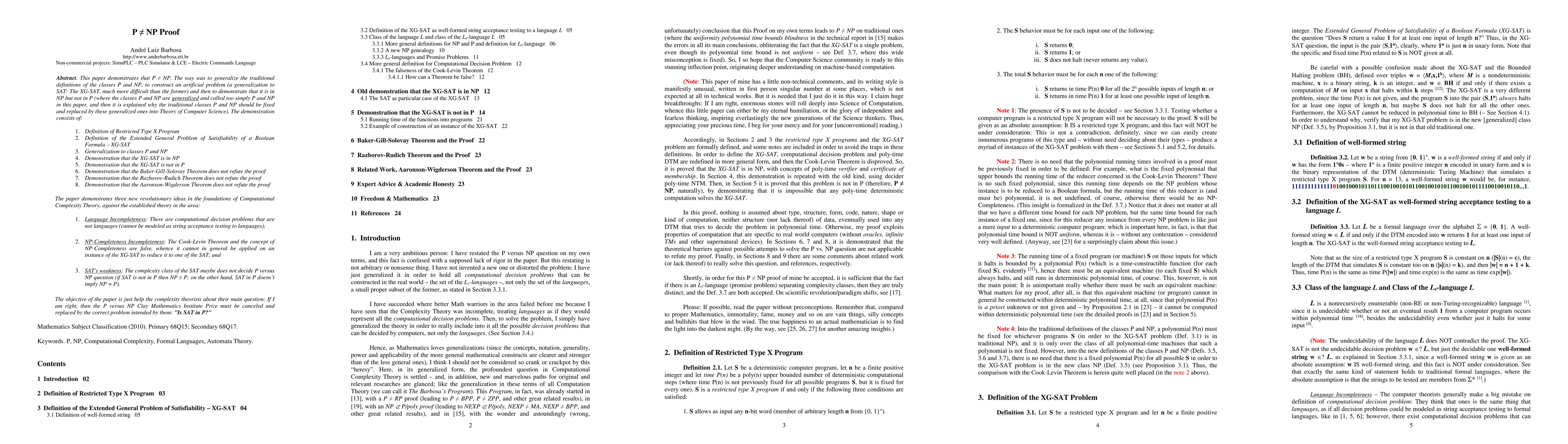 This paper demonstrates that P \not= NP. The way was to generalize the traditional definitions of the classes P and NP, to construct an artificial problem (a generalization to SAT: The XG-SAT, much more difficult than the former) and then to demonstrate that it is in NP but not in P (where the classes P and NP are generalized and called too simply P and NP in this paper, and then it is explained why the traditional classes P and NP should be fixed and replaced by these generalized ones into Theory of Computer Science). The demonstration consists of: 1. Definition of Restricted Type X Program; 2. Definition of the General Extended Problem of Satisfiability of a Boolean Formula - XG-SAT; 3. Generalization to classes P and NP; 4. Demonstration that the XG-SAT is in NP; 5. Demonstration that the XG-SAT is not in P; 6. Demonstration that the Baker-Gill-Solovay Theorem does not refute the proof; 7. Demonstration that the Razborov-Rudich Theorem does not refute the proof; 8. Demonstration that the Aaronson-Wigderson Theorem does not refute the proof.