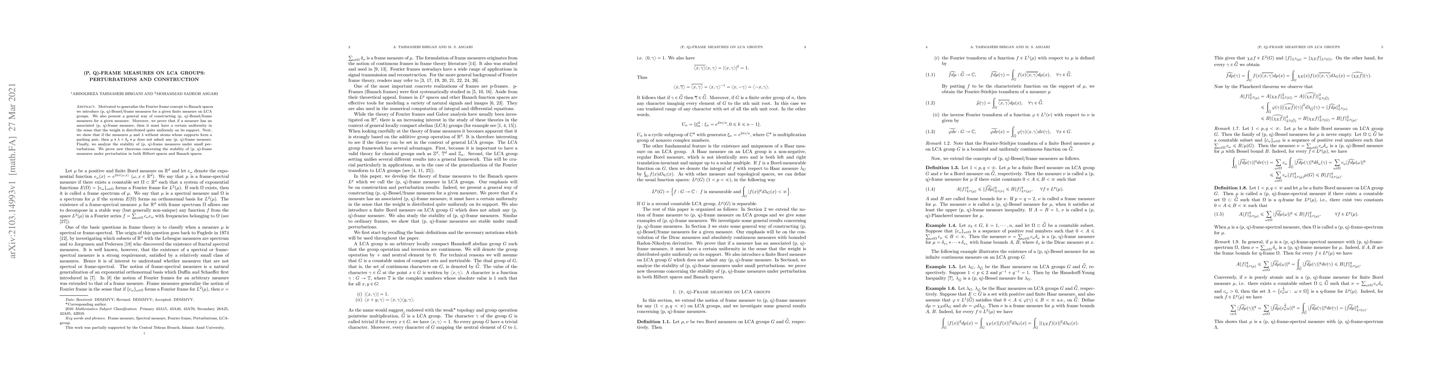 This paper introduces (p, q)-Bessel/frame measures on locally compact abelian (LCA) groups, generalizes the Fourier frame concept to Banach spaces, and presents construction methods for these measures. It also discusses the uniform distribution of weights and the instability of (p, q)-frame measures under perturbations.