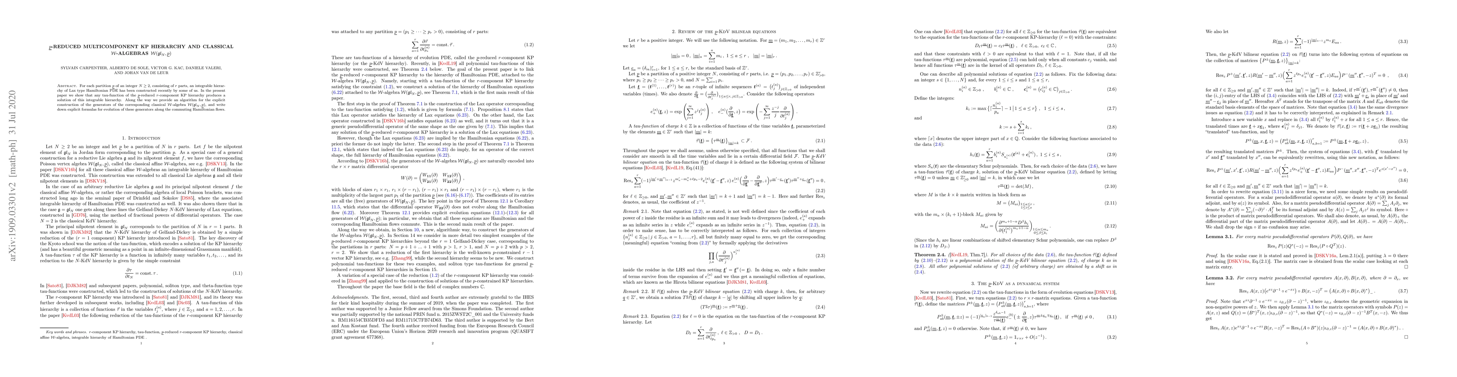 For each partition p of an integer N \geq 2, consisting of r parts, an integrable hierarchy of Lax type Hamiltonian PDE has been constructed recently by some of us. In the present paper we show that any tau-function of the p-reduced r-component KP hierarchy produces a solution of this integrable hierarchy. Along the way we provide an algorithm for the explicit construction of the generators of the corresponding classical W-algebra W(gl_N,p), and write down explicit formulas for evolution of these generators along the Hamiltonian flows.