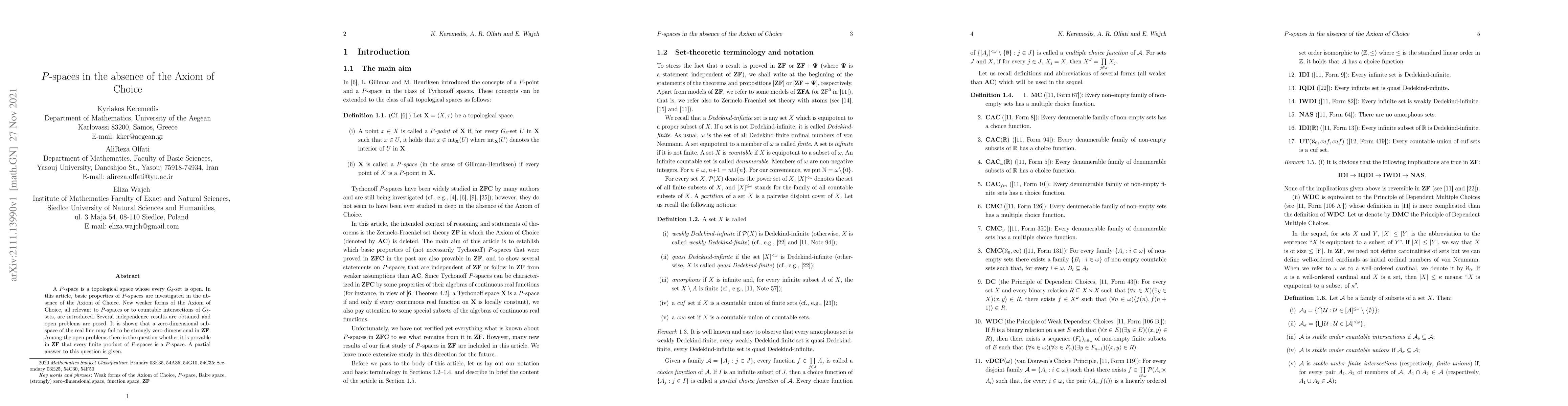 This paper explores $P$-spaces, where every $G_{delta}$-set is open, without the Axiom of Choice. It introduces weaker choice principles linked to $P$-spaces and countable $G_{delta}$ intersections. The research demonstrates that a zero-dimensional real line subspace may lack strong zero-dimensionality in ZF, and it partially answers the question on whether finite products of $P$-spaces remain $P$-spaces in ZF.