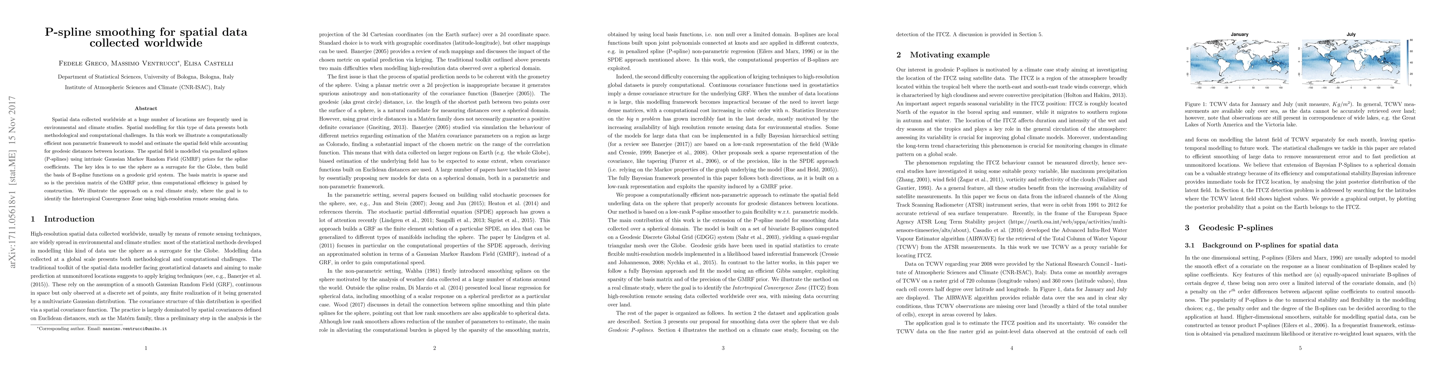 Spatial data collected worldwide at a huge number of locations are frequently used in environmental and climate studies. Spatial modelling for this type of data presents both methodological and computational challenges. In this work we illustrate a computationally efficient non parametric framework to model and estimate the spatial field while accounting for geodesic distances between locations. The spatial field is modelled via penalized splines (P-splines) using intrinsic Gaussian Markov Random Field (GMRF) priors for the spline coefficients. The key idea is to use the sphere as a surrogate for the Globe, then build the basis of B-spline functions on a geodesic grid system. The basis matrix is sparse and so is the precision matrix of the GMRF prior, thus computational efficiency is gained by construction. We illustrate the approach on a real climate study, where the goal is to identify the Intertropical Convergence Zone using high-resolution remote sensing data.