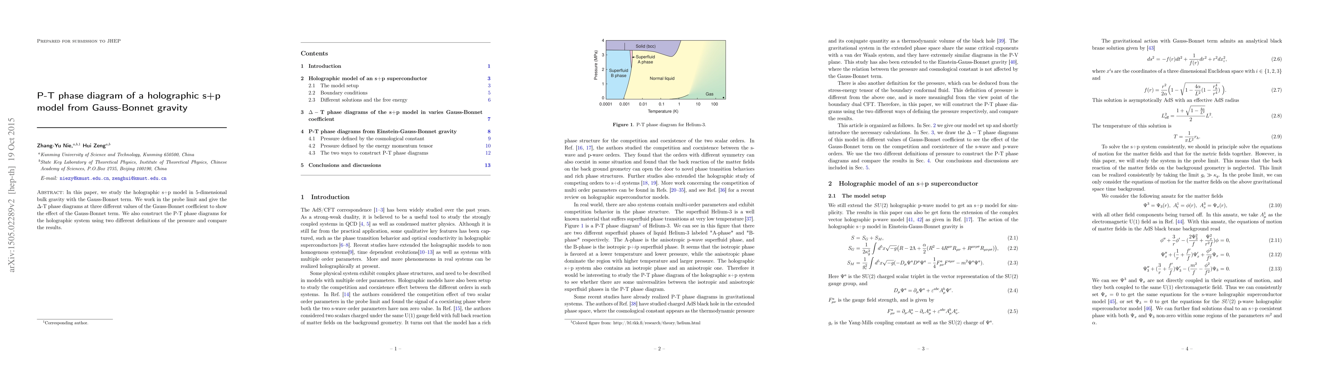 This research investigates the P-T phase diagrams of a holographic s+p model in 5D gravity with a Gauss-Bonnet term, providing $\Delta$-T phase diagrams at varying Gauss-Bonnet coefficients and comparing P-T diagrams using two pressure definitions.