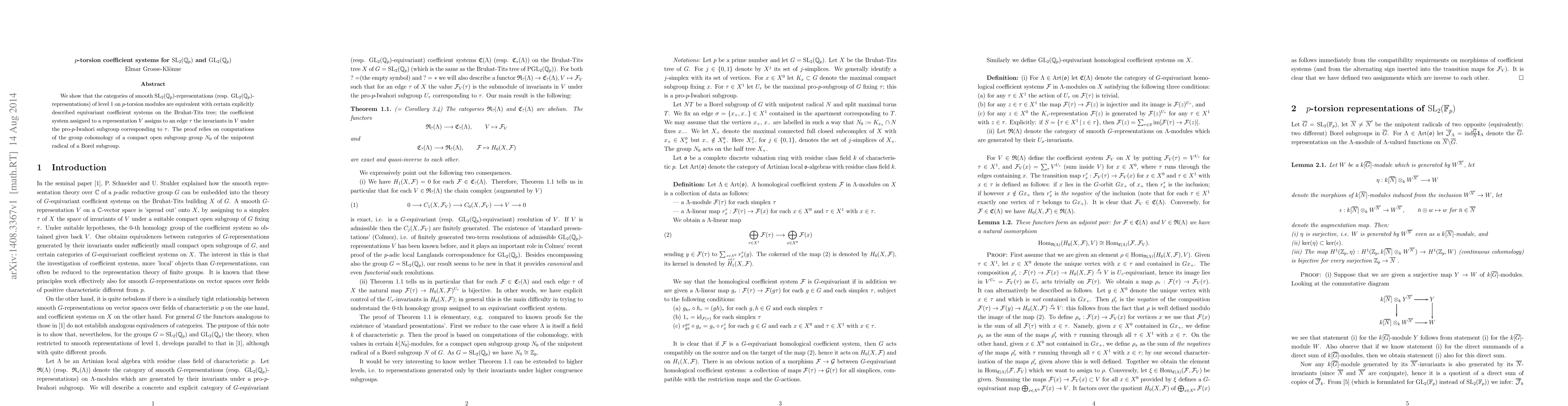 Summary: The paper demonstrates the equivalence between the category of level 1 smooth ${\rm SL}_2({\mathbb Q}_p)$-representations (or ${\rm GL}_2({\mathbb Q}_p)$-representations) on $p$-torsion modules and certain equivariant coefficient systems on the Bruhat-Tits tree, with proofs based on group cohomology computations of a compact open subgroup.