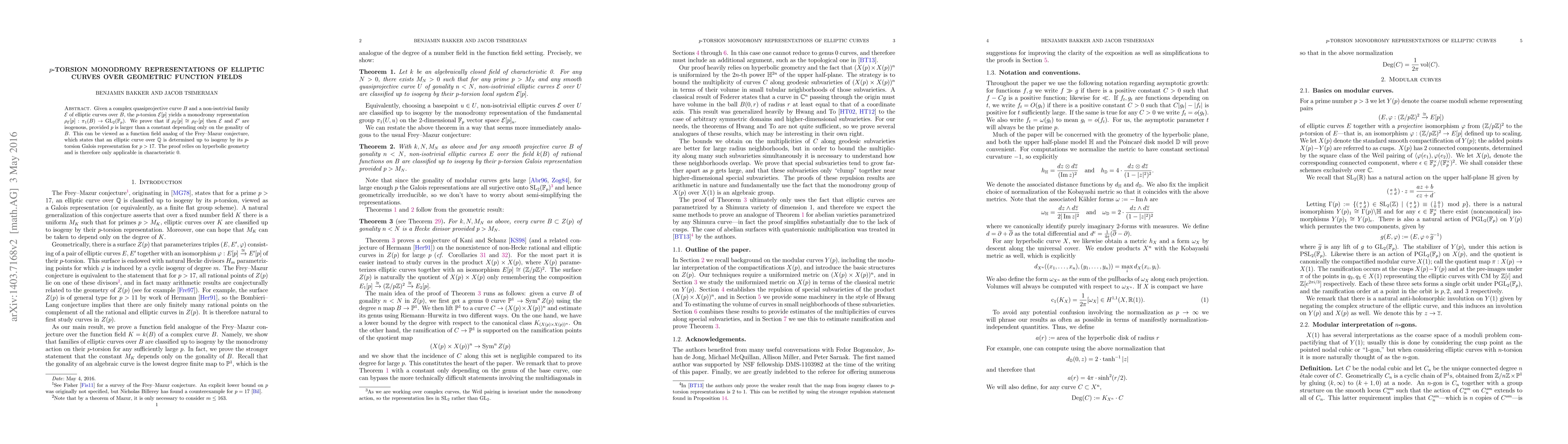 This paper establishes that for elliptic curves over a complex quasiprojective curve, $p$-torsion monodromy representations are isogeny invariants when $p$ exceeds a constant dependent on the curve's gonality. This result parallels the Frey-Mazur conjecture in number fields and is proven using hyperbolic geometry.