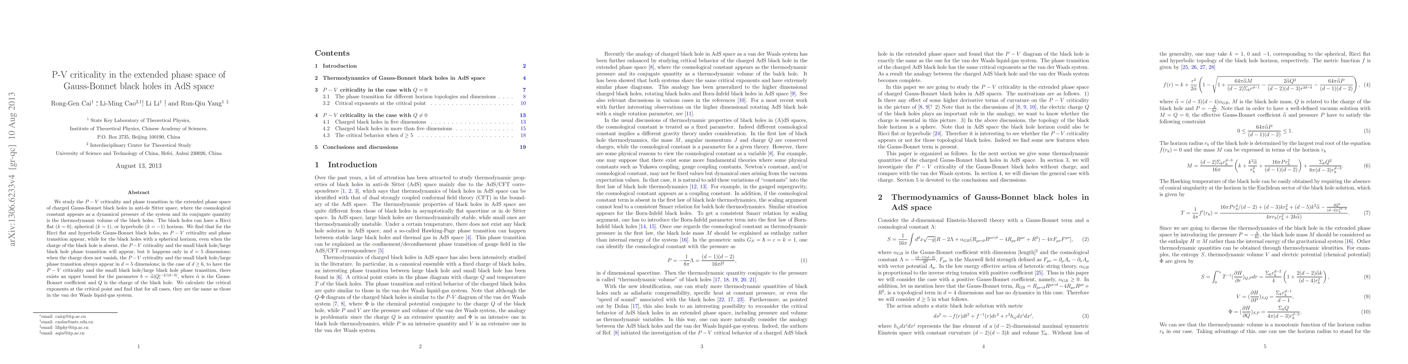 This research investigates $P-V$ criticality and phase transitions in charged Gauss-Bonnet black holes in AdS space, finding that Ricci flat and hyperbolic horizons lack such phenomena while spherical horizons exhibit them primarily in $d=5$ dimensions, with upper bounds for $d\ge 6$. Critical exponents match those of the van der Waals system.