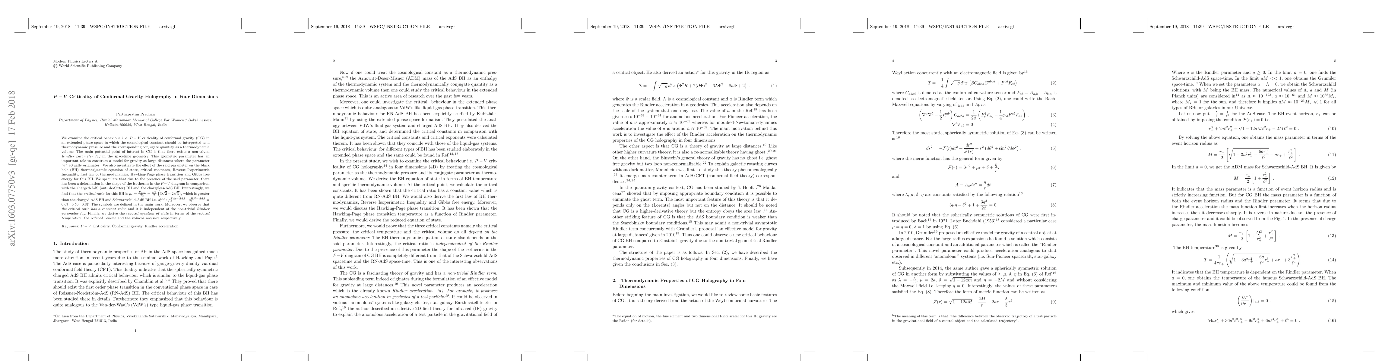 {We examine the critical behaviour i. e. $P-V$ criticality of conformal gravity~(CG) in an extended phase space in which the cosmological constant should be interpreted as a thermodynamic pressure and the corresponding conjugate quantity as a thermodynamic volume.} The main potential point of interest in CG is that there exists a {non-trivial} \emph{Rindler parameter ($a$)} in the {spacetime geometry. This geometric parameter has an important role to construct a model for gravity at large distances where the parameter "$a$" actually originates}. We also investigate the effect of the said parameter on the {black hole~(BH) \emph{thermodynamic} equation of state, critical constants, Reverse Isoperimetric Inequality,} {first law of thermodynamics, Hawking-Page phase transition and Gibbs free energy} for this BH. We speculate that due to the presence of the said parameter, there has been a deformation {in the shape} of {the} isotherms in the $P-V$ diagram in comparison with {the} charged-AdS~(anti de-Sitter) BH and {the} chargeless-AdS BH. Interestingly, we find {that} the \emph{critical ratio} for this BH is $\rho_{c} = \frac{P_{c} v_{c}}{T_{c}}= \frac{\sqrt{3}}{2}\left(3\sqrt{2}-2\sqrt{3}\right)$, which is greater than the charged AdS BH and Schwarzschild-AdS BH {i.e.} $\rho_{c}^{CG}:\rho_{c}^{Sch-AdS}:\rho_{c}^{RN-AdS} = 0.67:0.50:0.37$. The symbols are defined in the main work. Moreover, we observe that \emph{{the} critical ratio {has a constant value}} and {it is} independent of the {non-trivial} \emph{Rindler parameter ($a$)}. Finally, we derive {the} \emph{reduced equation of state} in terms of {the} \emph{reduced temperature}, {the} \emph{reduced volume} and {the} \emph{reduced pressure} respectively.