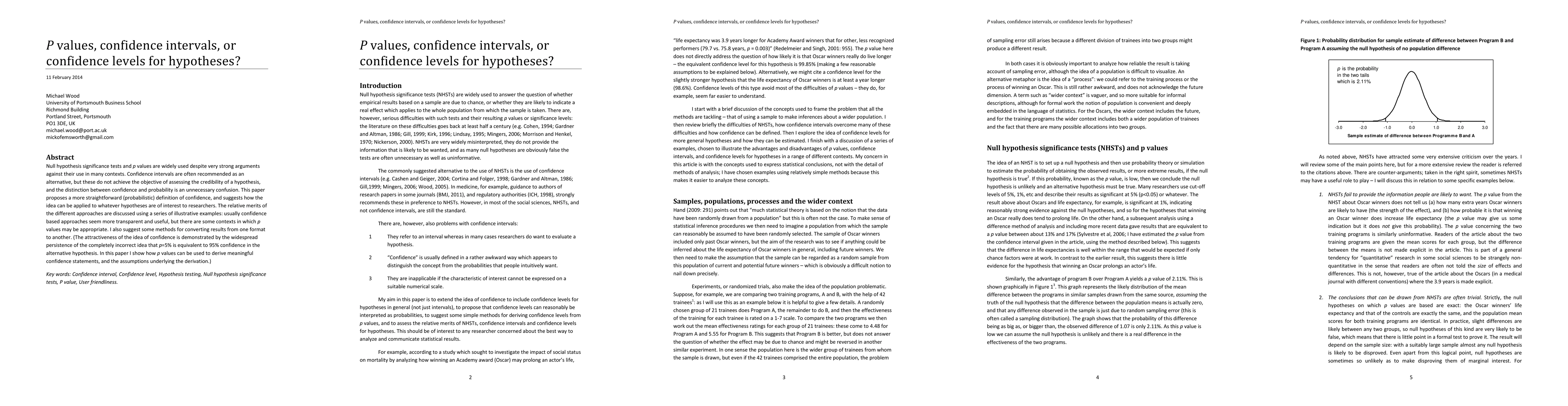 This paper critiques the use of p values in hypothesis testing and advocates for a more straightforward probabilistic definition of confidence levels as an alternative. It discusses the relative merits of confidence-based approaches versus p values, illustrating their application and conversion between formats for better transparency and utility in research.