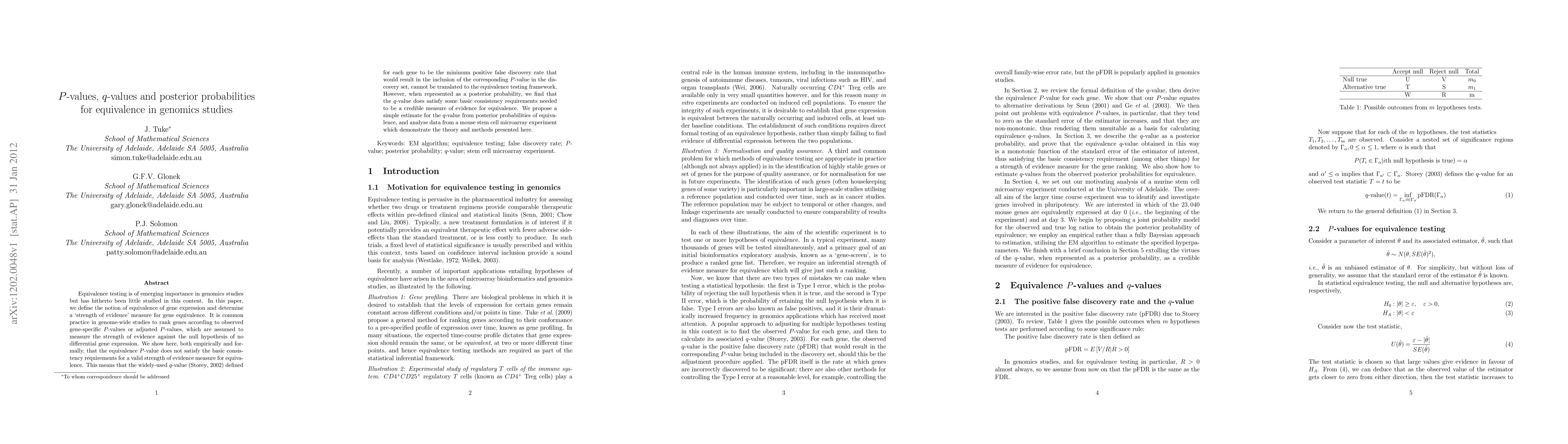 This paper discusses equivalence testing in genomics, highlighting that traditional P-values and q-values are inadequate for measuring evidence of gene equivalence. It proposes a new method using posterior probabilities to better assess gene equivalence, supported by analysis of a mouse stem cell microarray experiment.