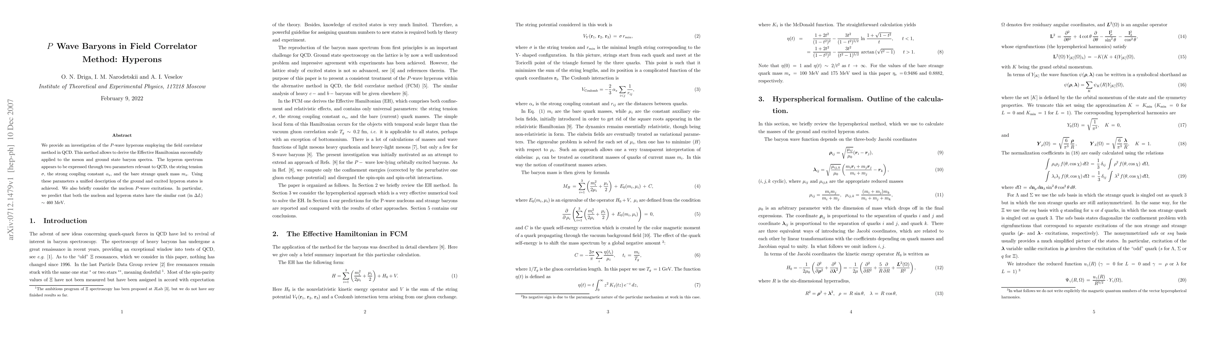 Researchers used the field correlator method to investigate P-wave hyperons in QCD, finding that their spectrum can be described with three parameters: string tension, strong coupling constant, and bare strange quark mass.