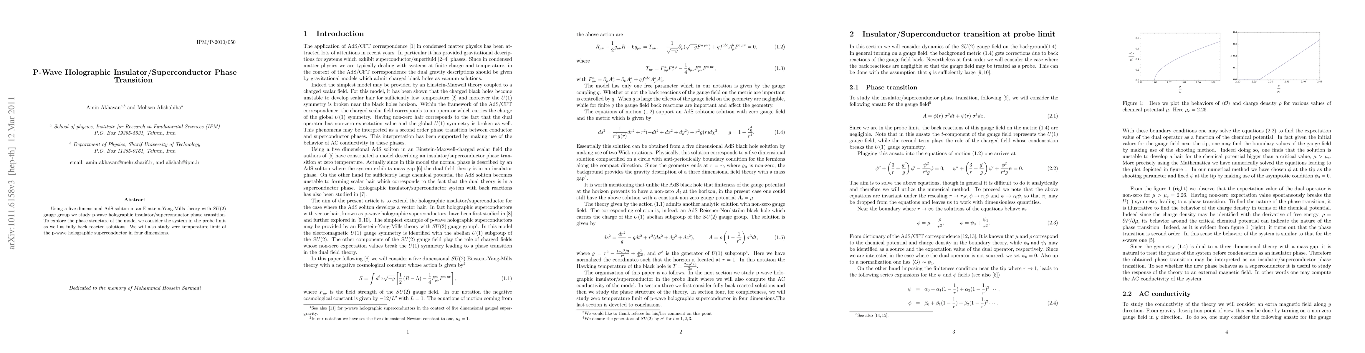 This paper investigates the p-wave holographic insulator/superconductor phase transition using a five-dimensional AdS soliton in an Einstein-Yang-Mills theory with an SU(2) gauge group, analyzing both probe limit and fully back-reacted solutions, and explores the zero-temperature limit in four dimensions.