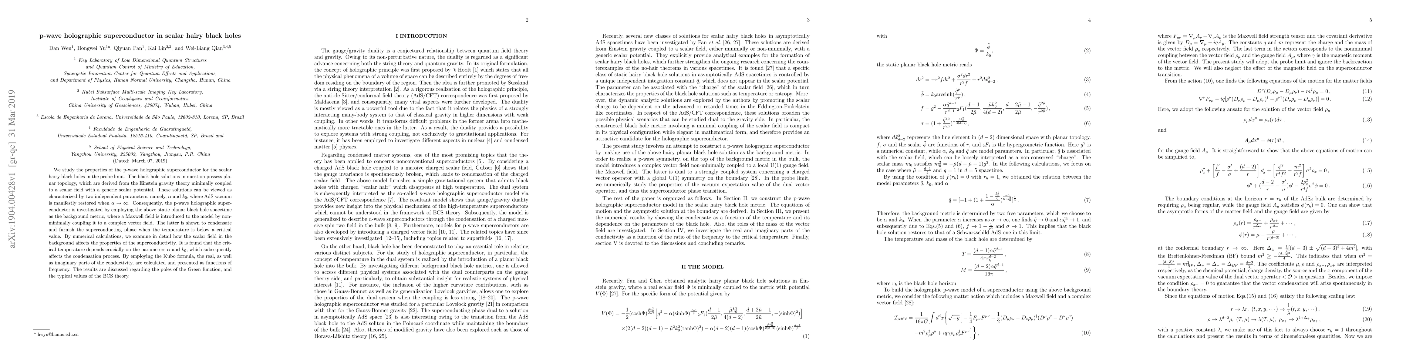 We study the properties of the p-wave holographic superconductor for the scalar hairy black holes in the probe limit. The black hole solutions in question possess planar topology, which are derived from the Einstein gravity theory minimally coupled to a scalar field with a generic scalar potential. These solutions can be viewed as characterized by two independent parameters, namely, $\alpha$ and $k_0$, where AdS vacuum is manifestly restored when $\alpha\to \infty$. Consequently, the p-wave holographic superconductor is investigated by employing the above static planar black hole spacetime as the background metric, where a Maxwell field is introduced to the model by nonminimally coupling it to a complex vector field. The latter is shown to condensate and furnish the superconducting phase when the temperature is below a critical value. By numerical calculations, we examine in detail how the scalar field in the background affects the properties of the superconductivity. It is found that the critical temperature depends crucially on the parameters $\alpha$ and $k_0$, which subsequently affects the condensation process. By employing the Kubo formula, the real, as well as imaginary parts of the conductivity, are calculated and presented as functions of frequency. The results are discussed regarding the poles of the Green function, and the typical values of the BCS theory.