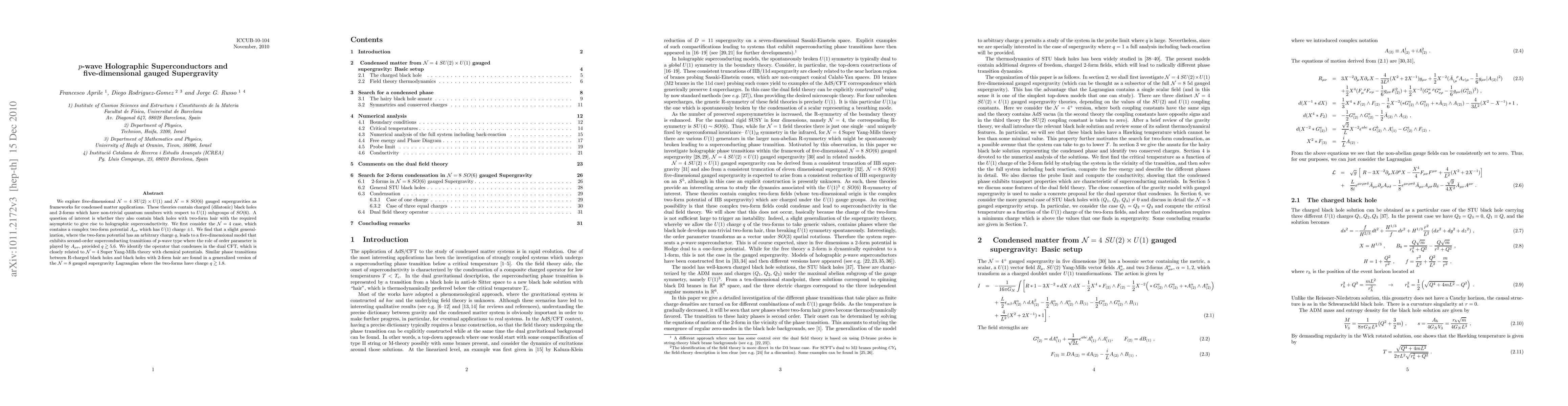 We explore five-dimensional ${\cal N}=4$ $SU(2)\times U(1)$ and ${\cal N}=8$ SO(6) gauged supergravities as frameworks for condensed matter applications. These theories contain charged (dilatonic) black holes and 2-forms which have non-trivial quantum numbers with respect to U(1) subgroups of SO(6). A question of interest is whether they also contain black holes with two-form hair with the required asymptotic to give rise to holographic superconductivity. We first consider the ${\cal N}=4$ case, which contains a complex two-form potential $A_{\mu\nu}$ which has U(1) charge $\pm 1$. We find that a slight generalization, where the two-form potential has an arbitrary charge $q$, leads to a five-dimensional model that exhibits second-order superconducting transitions of p-wave type where the role of order parameter is played by $A_{\mu\nu}$, provided $q \gtrsim 5.6$. We identify the operator that condenses in the dual CFT, which is closely related to ${\cal N}=4$ Super Yang-Mills theory with chemical potentials. Similar phase transitions between R-charged black holes and black holes with 2-form hair are found in a generalized version of the ${\cal N}=8$ gauged supergravity Lagrangian where the two-forms have charge $q\gtrsim 1.8$.