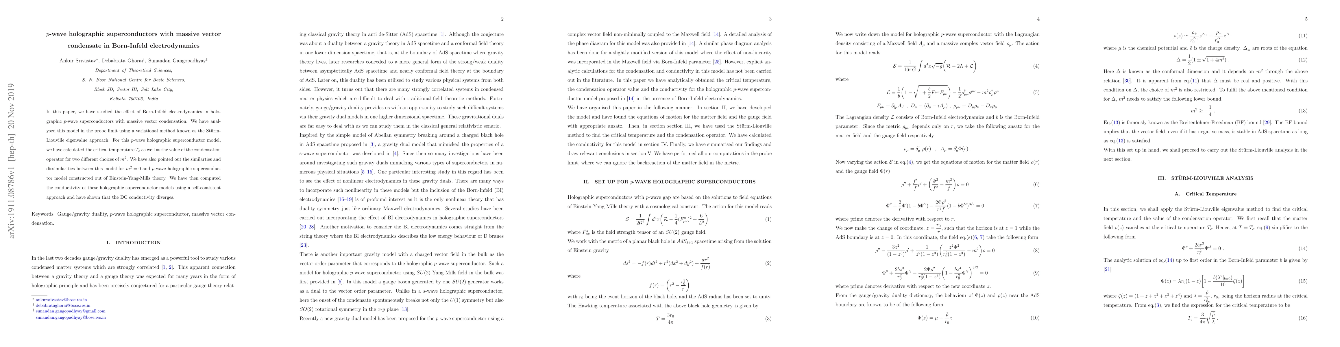This paper investigates the influence of Born-Infeld electrodynamics on $p$-wave holographic superconductors with massive vector condensation, analyzing the model via the Sturm-Liouville eigenvalue approach and calculating critical temperature and conductivity, showing the DC conductivity diverges. Comparisons with models from Einstein-Yang-Mills theory are also made.