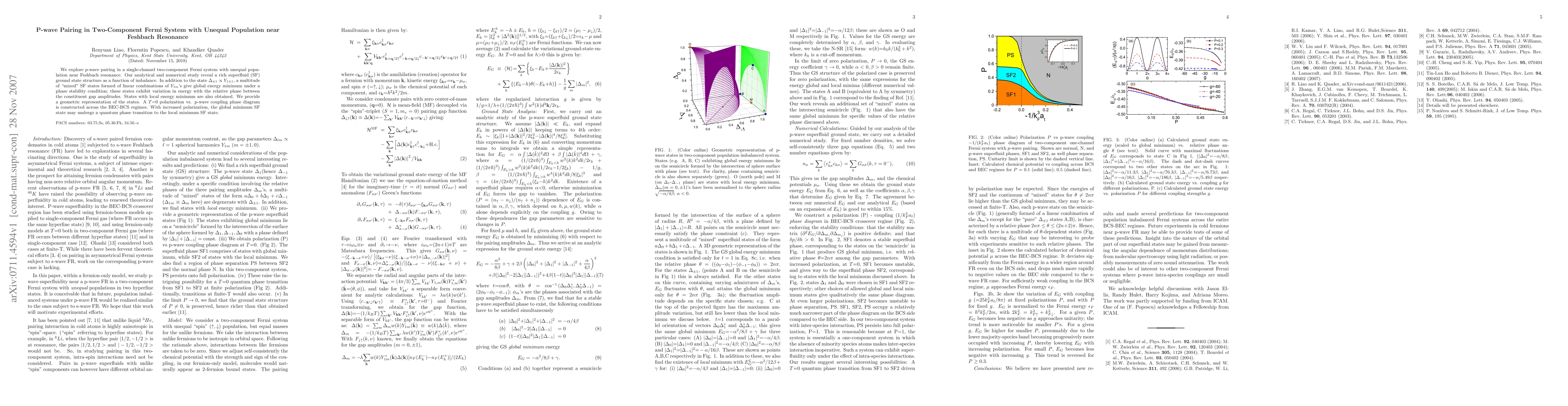 This paper investigates p-wave pairing in two-component Fermi systems with unequal population near Feshbach resonance. It reveals a complex superfluid ground state structure, including "mixed" states with varying energy dependent on the relative phase, and a potential quantum phase transition with increased polarization.