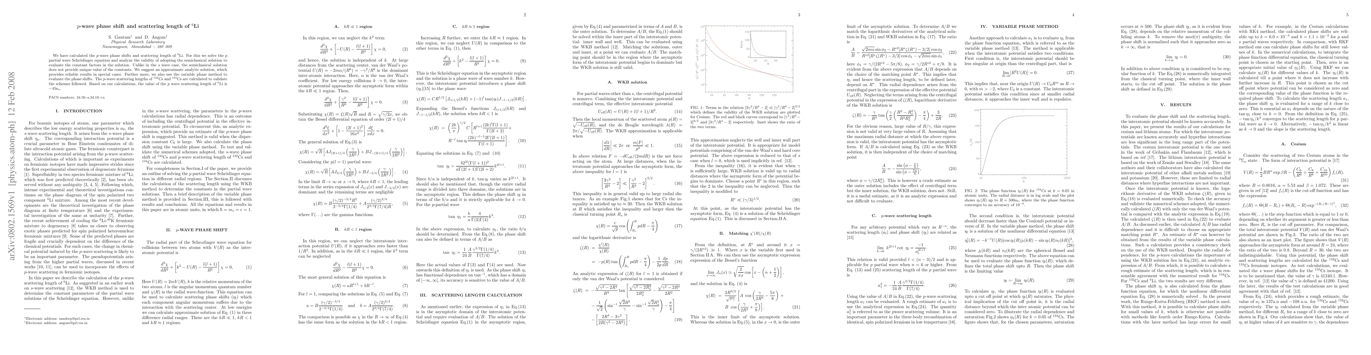 Researchers calculated the p-wave phase shifts and scattering length of $^6$Li using a combination of methods, including the semiclassical solution and variable phase method, finding a scattering length of $-45a_o$.