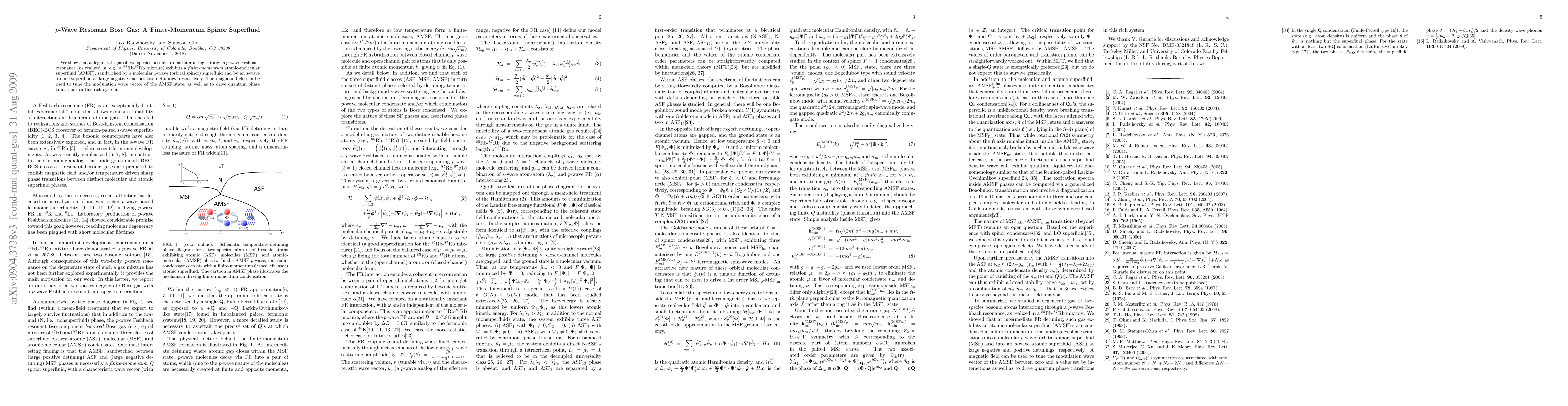 We show that a degenerate gas of two-species bosonic atoms interacting through a p-wave Feshbach resonance (as realized in, e.g., a 85Rb-87Rb mixture) exhibits a finite-momentum atomic-molecular superfluid (AMSF), sandwiched by a molecular p-wave (orbital spinor) superfluid and by an s-wave atomic superfluid at large negative and positive detunings, respectively. The magnetic field can be used to tune the modulation wave vector of the AMSF state, as well as to drive quantum phase transitions in this rich system.