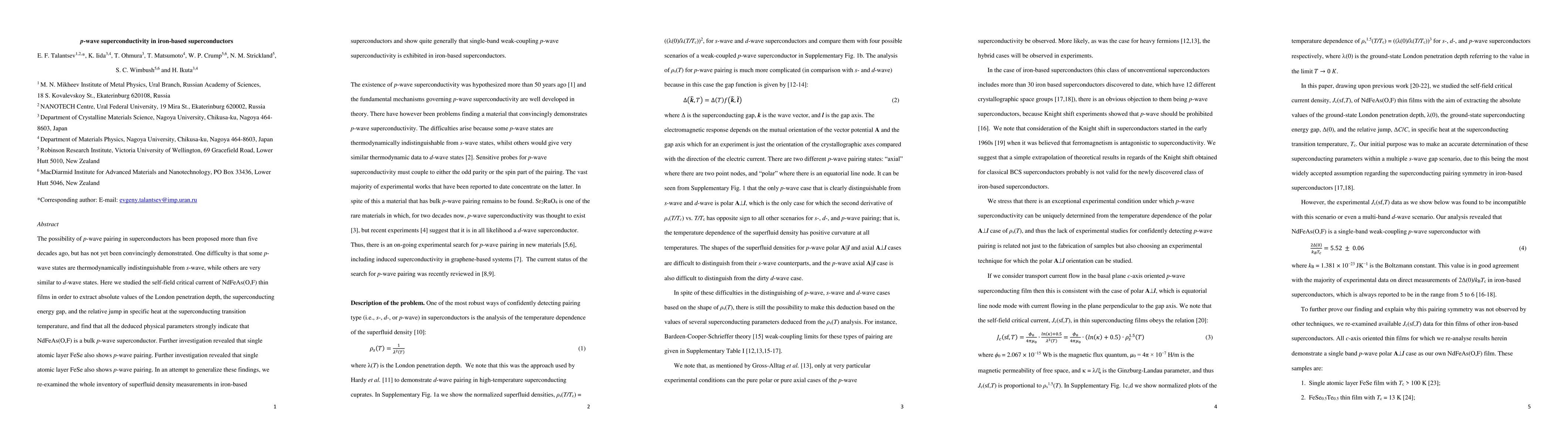 This paper demonstrates that NdFeAs(O,F) thin films and single atomic layer FeSe exhibit p-wave superconductivity, supported by measurements of London penetration depth and superconducting energy gap. The study suggests that most iron-based superconductors likely share this p-wave pairing state.