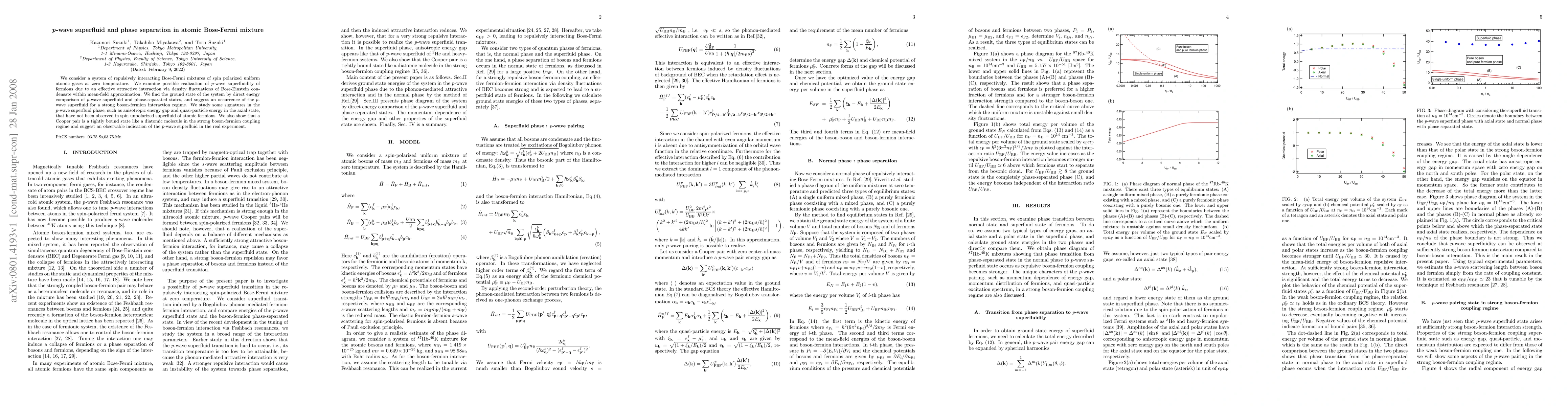 We consider a system of repulsively interacting Bose-Fermi mixtures of spin polarized uniform atomic gases at zero temperature. We examine possible realization of p-wave superfluidity of fermions due to an effective attractive interaction via density fluctuations of Bose-Einstein condensate within mean-field approximation. We find the ground state of the system by direct energy comparison of p-wave superfluid and phase-separated states, and suggest an occurrence of the p-wave superfluid for a strong boson-fermion interaction regime. We study some signatures in the p-wave superfluid phase, such as anisotropic energy gap and quasi-particle energy in the axial state, that have not been observed in spin unpolarized superfluid of atomic fermions. We also show that a Cooper pair is a tightly bound state like a diatomic molecule in the strong boson-fermion coupling regime and suggest an observable indication of the p-wave superfluid in the real experiment.