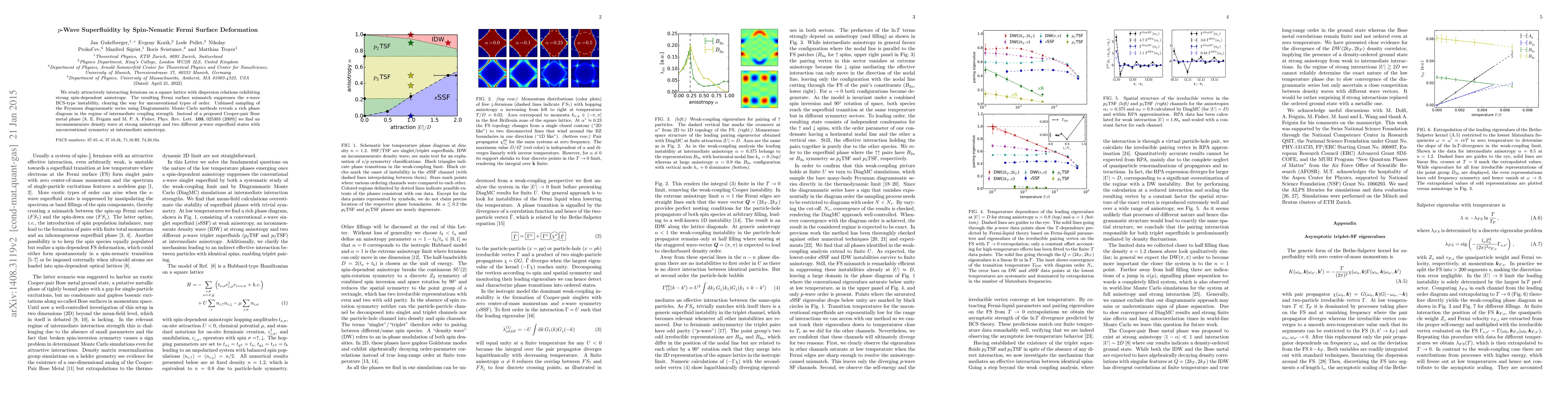 We study attractively interacting fermions on a square lattice with dispersion relations exhibiting strong spin-dependent anisotropy. The resulting Fermi surface mismatch suppresses the s-wave BCS-type instability, clearing the way for unconventional types of order. Unbiased sampling of the Feynman diagrammatic series using Diagrammatic Monte Carlo methods reveals a rich phase diagram in the regime of intermediate coupling strength. Instead of a proposed Cooper-pair Bose metal phase [A. E. Feiguin and M. P. A. Fisher, Phys. Rev. Lett. 103, 025303 (2009)] we find an incommensurate density wave at strong anisotropy and two different p-wave superfluid states with unconventional symmetry at intermediate anisotropy.