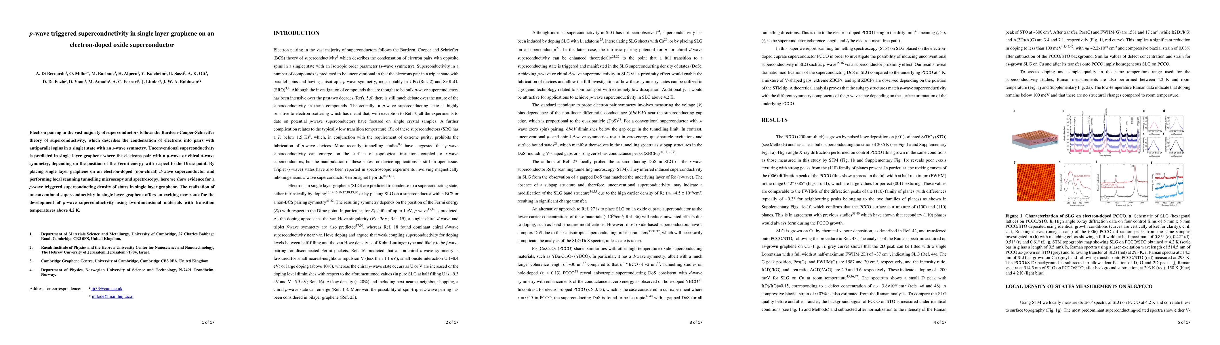 This research demonstrates p-wave triggered superconductivity in single layer graphene placed on an electron-doped oxide superconductor, using local scanning tunnelling microscopy and spectroscopy. This unconventional superconductivity in graphene provides a new pathway for developing p-wave superconductivity in two-dimensional materials.