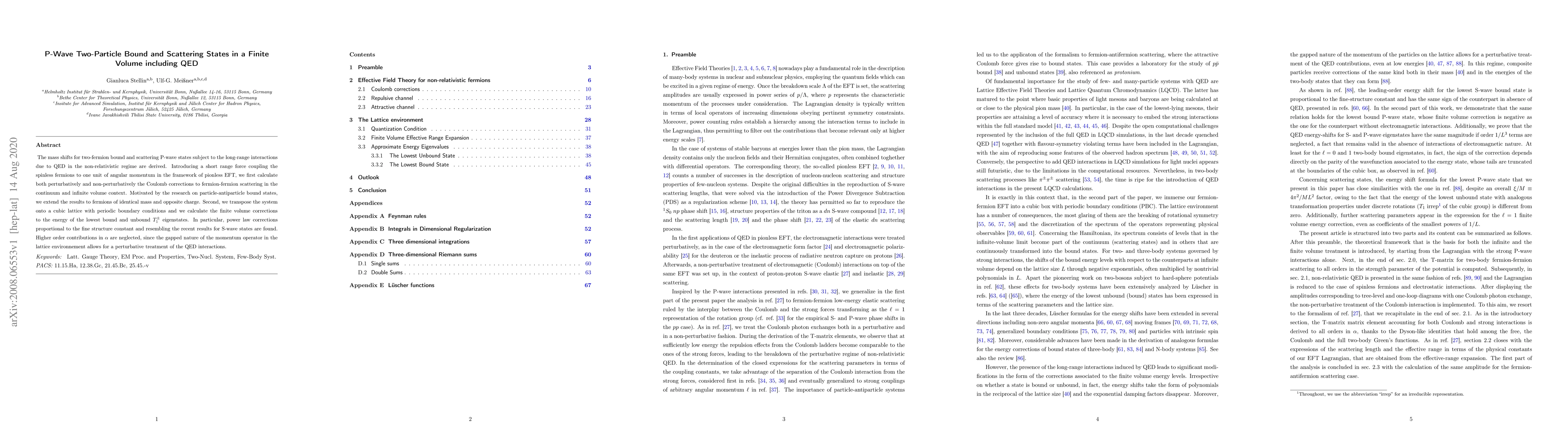 This paper derives mass shifts for P-wave two-fermion bound and scattering states under QED interactions, employing pionless EFT and lattice calculations. It finds power law corrections proportional to the fine structure constant for finite volume effects, similar to S-wave states.