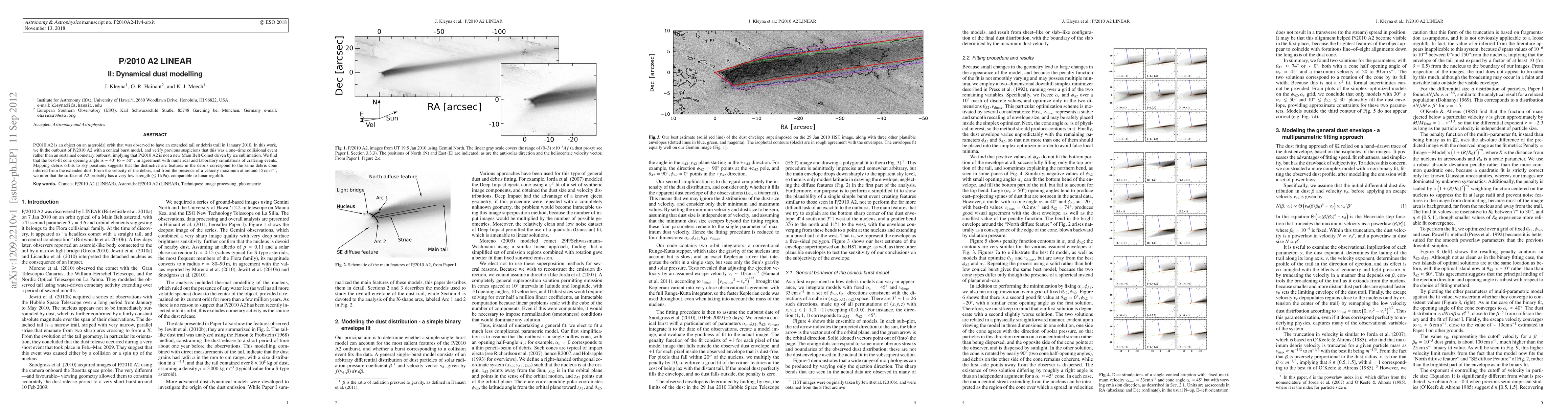P/2010 A2 is an object on an asteroidal orbit that was observed to have an extended tail or debris trail in January 2010. In this work, we fit the outburst of P/2010 A2 with a conical burst model, and verify previous suspicions that this was a one--time collisional event rather than an sustained cometary outburst, implying that P/2010 A2 is not a new Main Belt Comet driven by ice sublimation. We find that the best--fit cone opening angle is about 40 to 50 degrees, in agreement with numerical and laboratory simulations of cratering events. Mapping debris orbits to sky positions suggests that the distinctive arc features in the debris correspond to the same debris cone inferred from the extended dust. From the velocity of the debris, and from the presence of a velocity maximum at around 15 cm/s, we infer that the surface of A2 probably has a very low strength (<1 kPa), comparable to lunar regolith.
