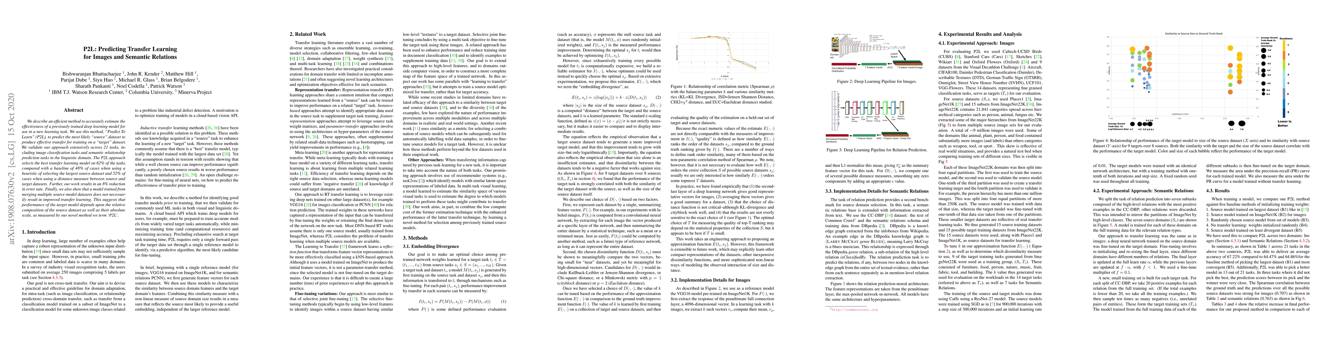 Transfer learning enhances learning across tasks, by leveraging previously learned representations -- if they are properly chosen. We describe an efficient method to accurately estimate the appropriateness of a previously trained model for use in a new learning task. We use this measure, which we call "Predict To Learn" ("P2L"), in the two very different domains of images and semantic relations, where it predicts, from a set of "source" models, the one model most likely to produce effective transfer for training a given "target" model. We validate our approach thoroughly, by assembling a collection of candidate source models, then fine-tuning each candidate to perform each of a collection of target tasks, and finally measuring how well transfer has been enhanced. Across 95 tasks within multiple domains (images classification and semantic relations), the P2L approach was able to select the best transfer learning model on average, while the heuristic of choosing model trained with the largest data set selected the best model in only 55 cases. These results suggest that P2L captures important information in common between source and target tasks, and that this shared informational structure contributes to successful transfer learning more than simple data size.