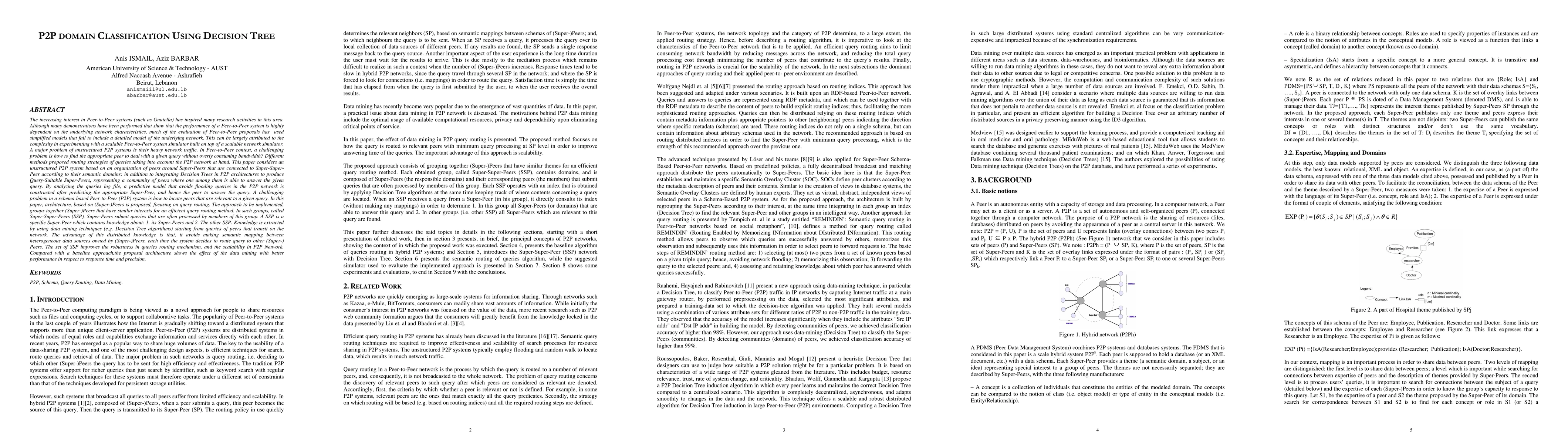This paper proposes a P2P domain classification architecture using Decision Trees to group Super-Peers into Super-Super-Peers based on query similarity, enhancing efficient query routing and improving scalability and response time compared to baseline methods.