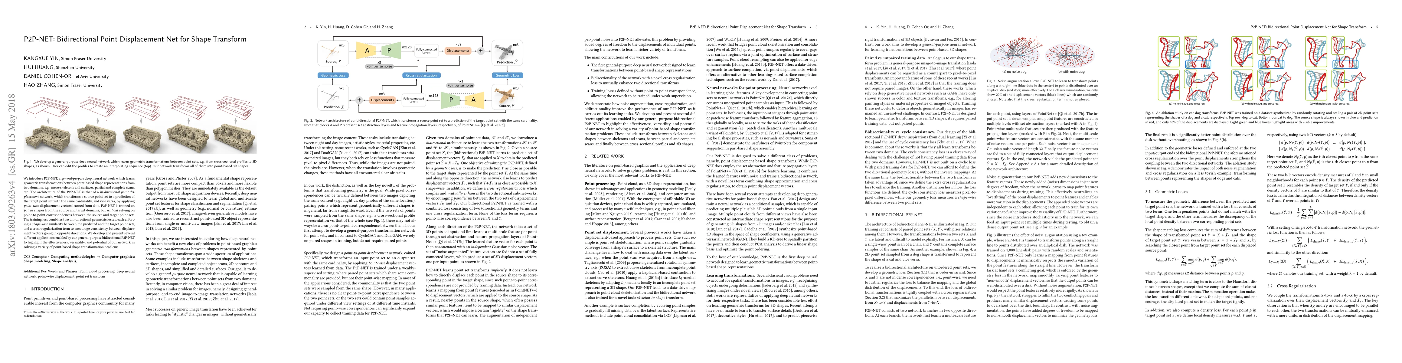 We introduce P2P-NET, a general-purpose deep neural network which learns geometric transformations between point-based shape representations from two domains, e.g., meso-skeletons and surfaces, partial and complete scans, etc. The architecture of the P2P-NET is that of a bi-directional point displacement network, which transforms a source point set to a target point set with the same cardinality, and vice versa, by applying point-wise displacement vectors learned from data. P2P-NET is trained on paired shapes from the source and target domains, but without relying on point-to-point correspondences between the source and target point sets. The training loss combines two uni-directional geometric losses, each enforcing a shape-wise similarity between the predicted and the target point sets, and a cross-regularization term to encourage consistency between displacement vectors going in opposite directions. We develop and present several different applications enabled by our general-purpose bidirectional P2P-NET to highlight the effectiveness, versatility, and potential of our network in solving a variety of point-based shape transformation problems.