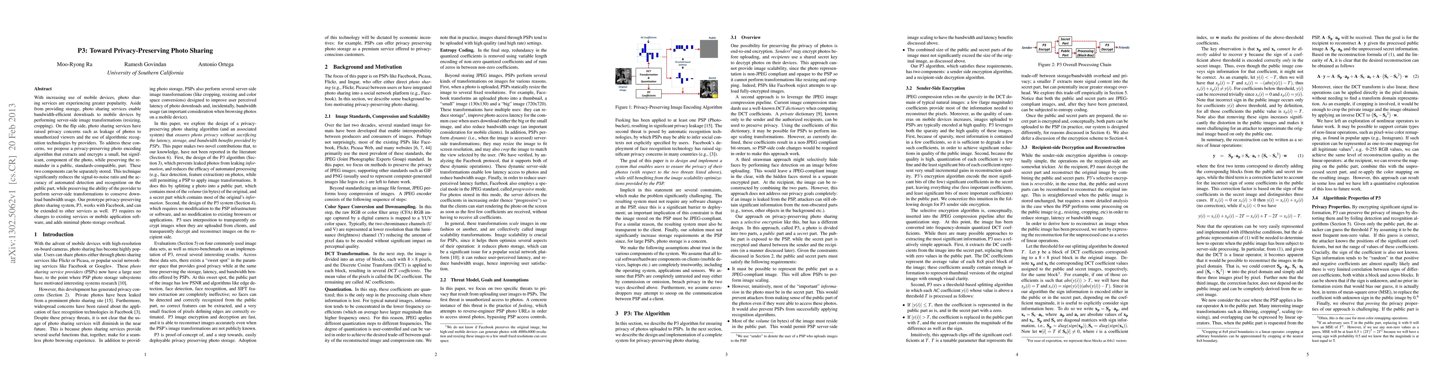 With increasing use of mobile devices, photo sharing services are experiencing greater popularity. Aside from providing storage, photo sharing services enable bandwidth-efficient downloads to mobile devices by performing server-side image transformations (resizing, cropping). On the flip side, photo sharing services have raised privacy concerns such as leakage of photos to unauthorized viewers and the use of algorithmic recognition technologies by providers. To address these concerns, we propose a privacy-preserving photo encoding algorithm that extracts and encrypts a small, but significant, component of the photo, while preserving the remainder in a public, standards-compatible, part. These two components can be separately stored. This technique significantly reduces the signal-to-noise ratio and the accuracy of automated detection and recognition on the public part, while preserving the ability of the provider to perform server-side transformations to conserve download bandwidth usage. Our prototype privacy-preserving photo sharing system, P3, works with Facebook, and can be extended to other services as well. P3 requires no changes to existing services or mobile application software, and adds minimal photo storage overhead.