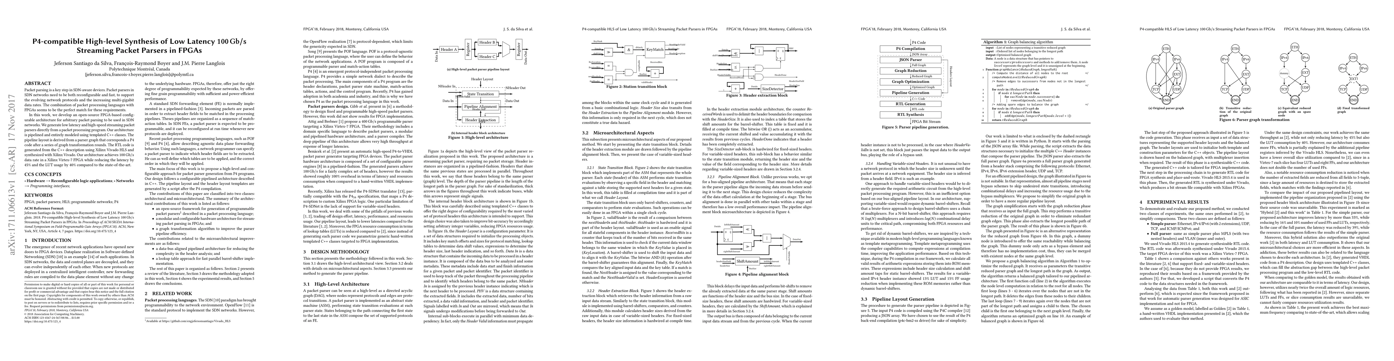 Packet parsing is a key step in SDN-aware devices. Packet parsers in SDN networks need to be both reconfigurable and fast, to support the evolving network protocols and the increasing multi-gigabit data rates. The combination of packet processing languages with FPGAs seems to be the perfect match for these requirements. In this work, we develop an open-source FPGA-based configurable architecture for arbitrary packet parsing to be used in SDN networks. We generate low latency and high-speed streaming packet parsers directly from a packet processing program. Our architecture is pipelined and entirely modeled using templated C++ classes. The pipeline layout is derived from a parser graph that corresponds a P4 code after a series of graph transformation rounds. The RTL code is generated from the C++ description using Xilinx Vivado HLS and synthesized with Xilinx Vivado. Our architecture achieves 100 Gb/s data rate in a Xilinx Virtex-7 FPGA while reducing the latency by 45% and the LUT usage by 40% compared to the state-of-the-art.