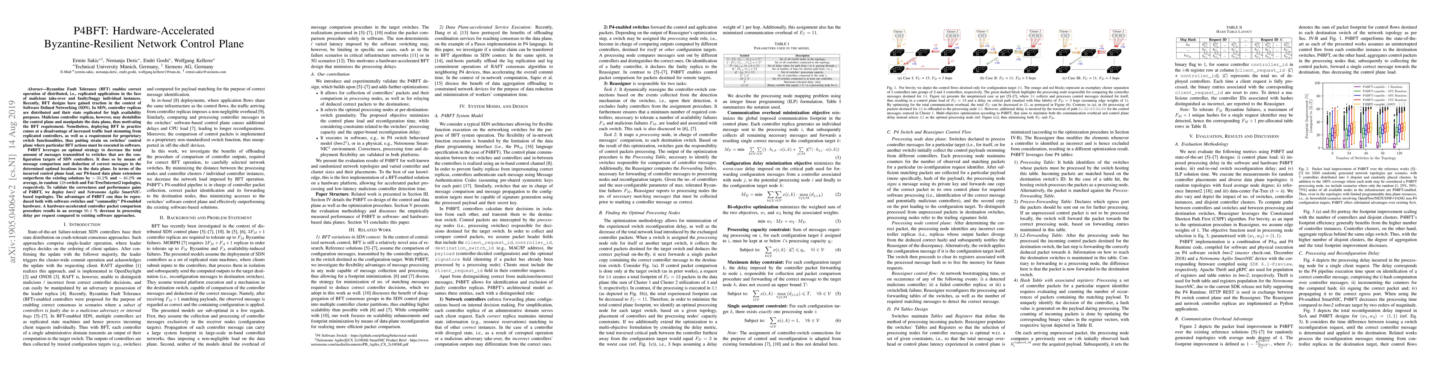P4BFT introduces a hardware-accelerated Byzantine Fault Tolerance (BFT) strategy for Software Defined Networking (SDN) control planes, significantly reducing control plane load and processing delays. It leverages P4-based data plane extensions to outperform existing solutions by ~33.2% and ~40.2% on average, and achieves a 96.4% decrease in processing delay per request through hardware acceleration.