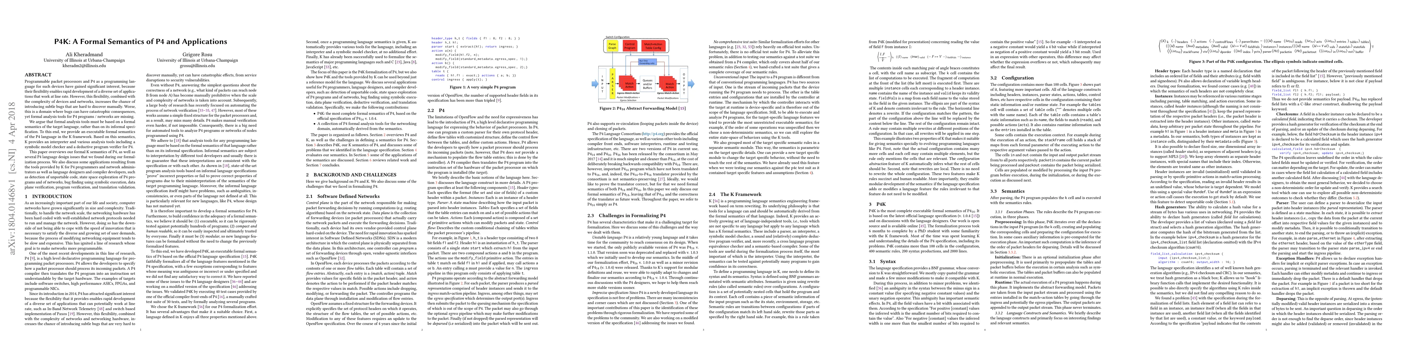 This work is novel as it formalizes P4 using the K framework, addressing the need for formal analysis tools in a domain where bugs can have severe consequences and such tools are currently missing.