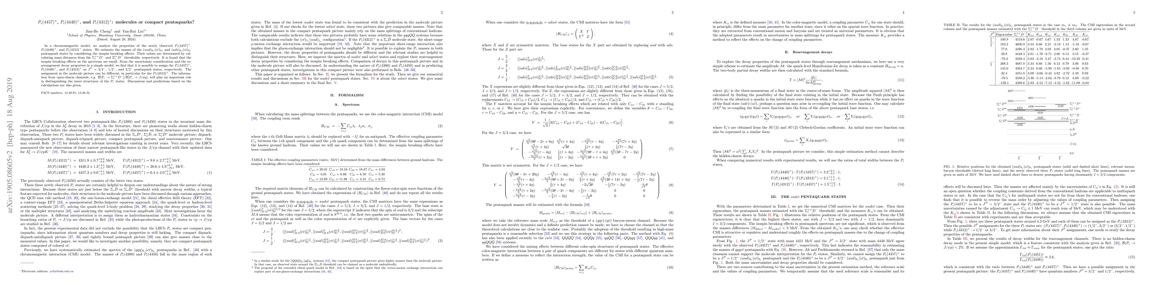 In a chromomagnetic model, we analyse the properties of the newly observed $P_c(4457)^+$, $P_c(4440)^+$, and $P_c(4312)^+$ states. We estimate the masses of the $(uud)_{8_c}(c\bar{c})_{8_c}$ and $(uds)_{8_c}(c\bar{c})_{8_c}$ pentaquark states by considering the isospin breaking effects. Their values are determined by calculating mass distances from the $\Sigma_c^{++}D^-$ and $\Xi_c^{\prime+}D^-$ thresholds, respectively. It is found that the isospin breaking effects on the spectrum are small. From the uncertainty consideration and the rearrangement decay properties in a simple model, we find that it is possible to assign the $P_c(4457)^+$, $P_c(4440)^+$, and $P_c(4312)^+$ as $J^P=3/2^-$, $1/2^-$, and $3/2^-$ pentaquark states, respectively. The assignment in the molecule picture can be different, in particular for the $P_c(4312)^+$. The information from open-charm channels, e.g. ${\cal B}[P_c\to\Sigma_c^{++}D^-]/{\cal B}[P_c\to J/\psi p]$, will play an important role in distinguishing the inner structures of the $P_c$ states. Discussions and predictions based on the calculations are also given.