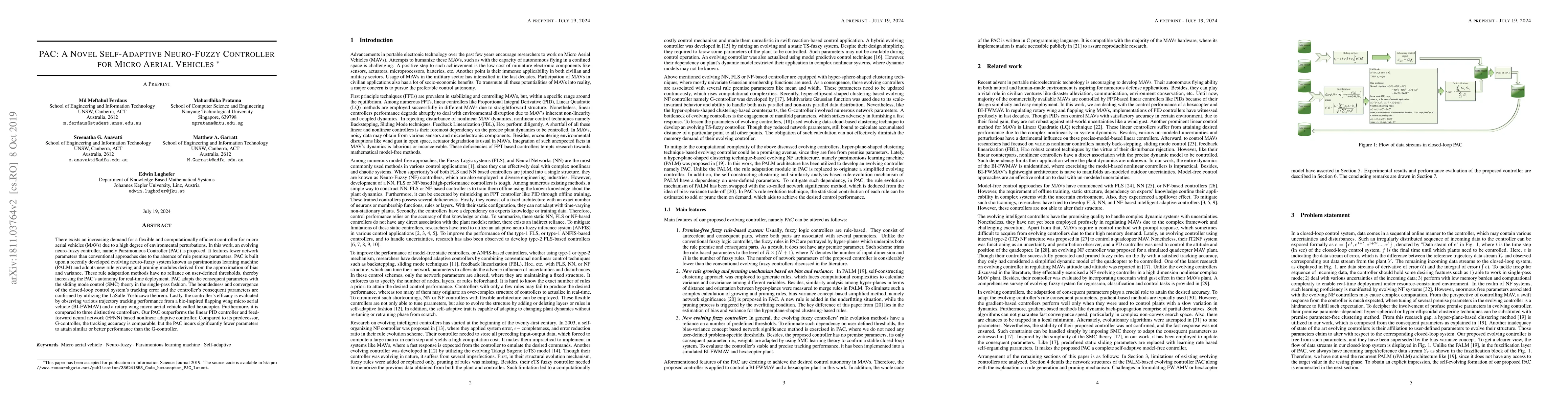 This paper proposes a novel self-adaptive neuro-fuzzy controller, PAC, for micro aerial vehicles, which features fewer network parameters and improved computational efficiency. The PAC controller, based on the parsimonious learning machine, adapts rules without user-defined thresholds and achieves better performance compared to linear PID and FFNN controllers, while using fewer parameters than its predecessor.