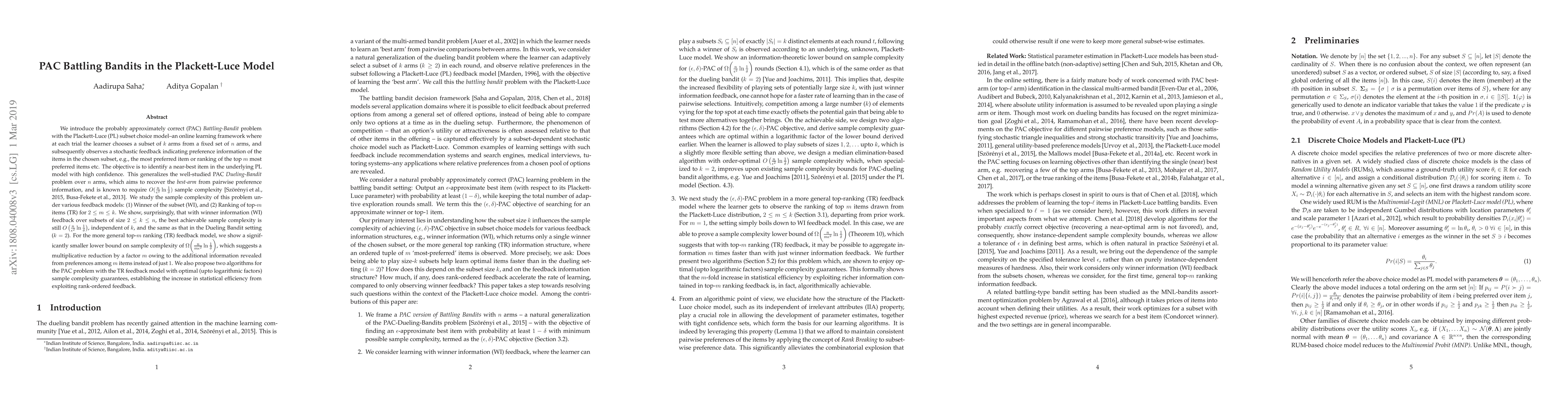 We introduce the probably approximately correct (PAC) \emph{Battling-Bandit} problem with the Plackett-Luce (PL) subset choice model--an online learning framework where at each trial the learner chooses a subset of $k$ arms from a fixed set of $n$ arms, and subsequently observes a stochastic feedback indicating preference information of the items in the chosen subset, e.g., the most preferred item or ranking of the top $m$ most preferred items etc. The objective is to identify a near-best item in the underlying PL model with high confidence. This generalizes the well-studied PAC \emph{Dueling-Bandit} problem over $n$ arms, which aims to recover the \emph{best-arm} from pairwise preference information, and is known to require $O(\frac{n}{\epsilon^2} \ln \frac{1}{\delta})$ sample complexity \citep{Busa_pl,Busa_top}. We study the sample complexity of this problem under various feedback models: (1) Winner of the subset (WI), and (2) Ranking of top-$m$ items (TR) for $2\le m \le k$. We show, surprisingly, that with winner information (WI) feedback over subsets of size $2 \leq k \leq n$, the best achievable sample complexity is still $O\left( \frac{n}{\epsilon^2} \ln \frac{1}{\delta}\right)$, independent of $k$, and the same as that in the Dueling Bandit setting ($k=2$). For the more general top-$m$ ranking (TR) feedback model, we show a significantly smaller lower bound on sample complexity of $\Omega\bigg( \frac{n}{m\epsilon^2} \ln \frac{1}{\delta}\bigg)$, which suggests a multiplicative reduction by a factor ${m}$ owing to the additional information revealed from preferences among $m$ items instead of just $1$. We also propose two algorithms for the PAC problem with the TR feedback model with optimal (upto logarithmic factors) sample complexity guarantees, establishing the increase in statistical efficiency from exploiting rank-ordered feedback.